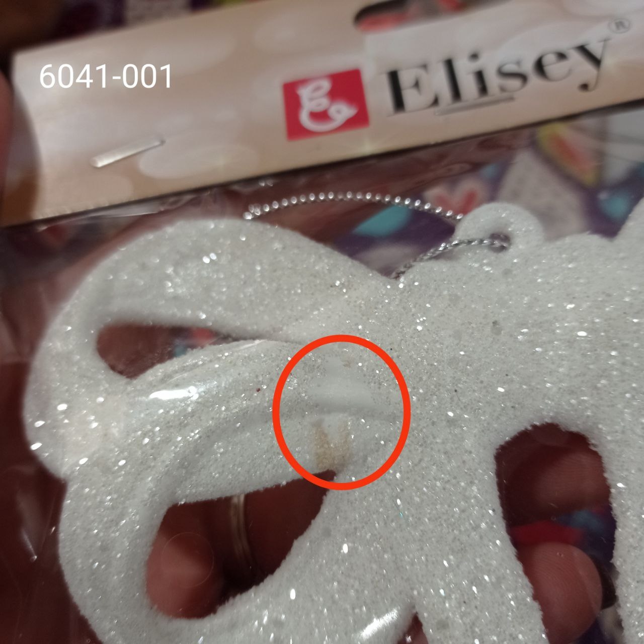Біла блискуча ялинкова іграшка з пластику у вигляді бантику стане яскравим акцентом у вашому святковому декорі. Її поверхня вкрита дрібними блискітками, які красиво переливаються під світлом гірлянд, створюючи ефект розсіяного сяйва. Легка та міцна, вона ідеально підходить для прикрашання ялинки, надаючи їй ніжності та святкового шарму.