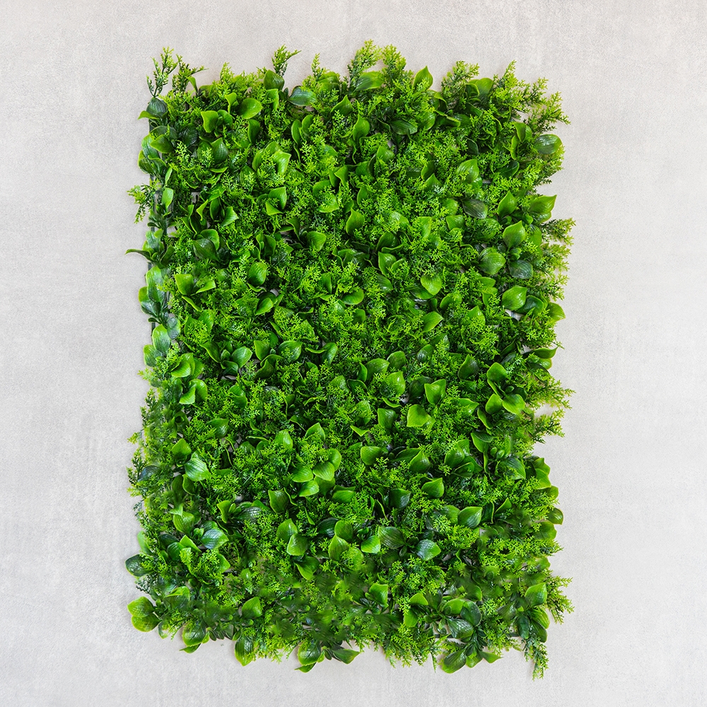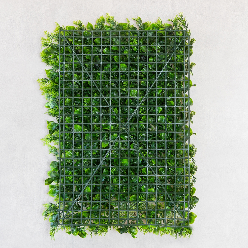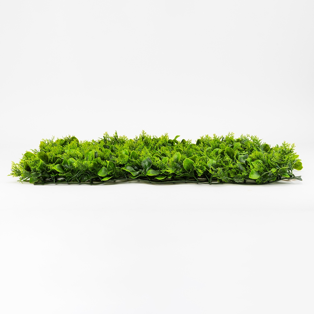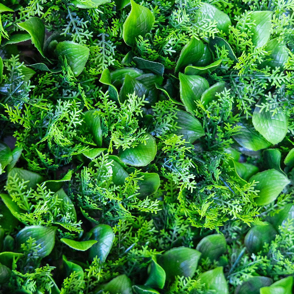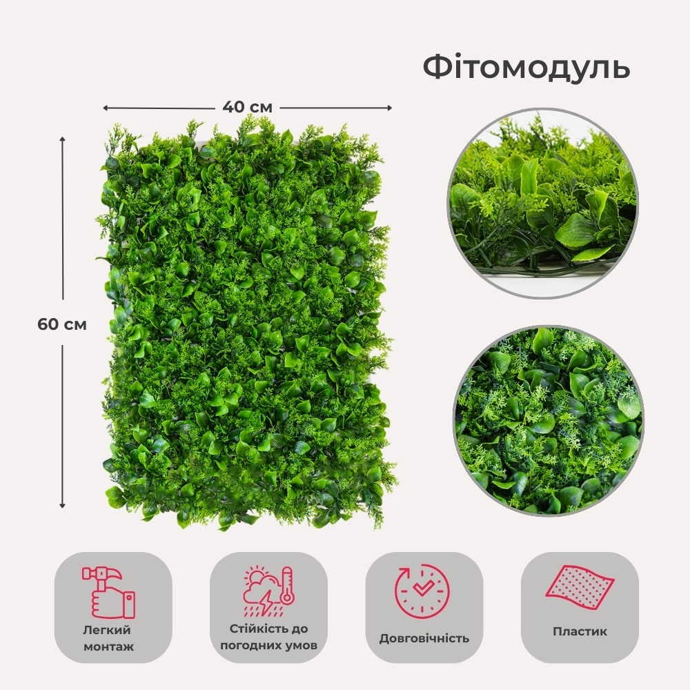 Довжина панелі — 60 см, ширина — 40 см, висота — 5 см. Декоративна панель зі штучної зелені — стильне рішення для вертикального або горизонтального озеленення будь-якого простору. Реалістичне листя різних відтінків і текстур створює ефект живої рослинності, додаючи інтер’єру свіжості та природної гармонії. Фітомодуль має міцну пластикову основу з кліпсами по краях, завдяки чому кілька елементів легко з’єднуються між собою у велику зелену стіну. Підходить для оформлення інтер’єрів, вітрин, фотозон, терас, зон відпочинку, кафе, ресторанів і офісів. Може використовуватись у приміщенні або на вулиці під накриттям, не вимагає догляду, не вицвітає та зберігає колір протягом тривалого часу. Ідеальний варіант для тих, хто хоче створити атмосферу природи без зайвих зусиль.