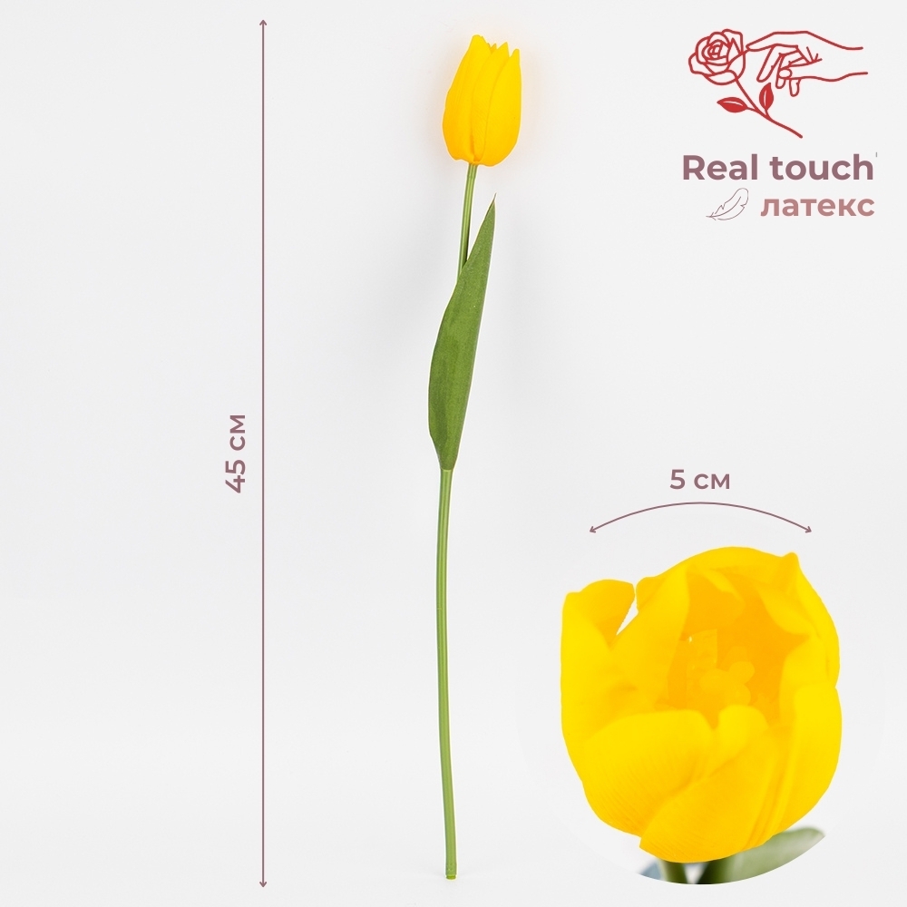 Висота — 45 см. Діаметр бутона — 5 см. Штучний тюльпан з колекції «Ніжний дотик» вражає своєю реалістичністю — пелюстки мають м’яку натуральну текстуру, яку практично неможливо відрізнити від живої квітки. Міцне та водночас гнучке стебло дозволяє легко надавати тюльпану потрібну форму, що робить його ідеальним для флористичних композицій, оформлення фотозон, залів, святкових декорацій чи інтер’єрного декору. Листя з латексу додає ще більше природності та глибини образу. Професійний вибір для ресторанів, готелів, фотостудій та флористів, яким потрібна квітка, що не відрізняється від живої та зберігає бездоганний вигляд у будь-яких умовах.