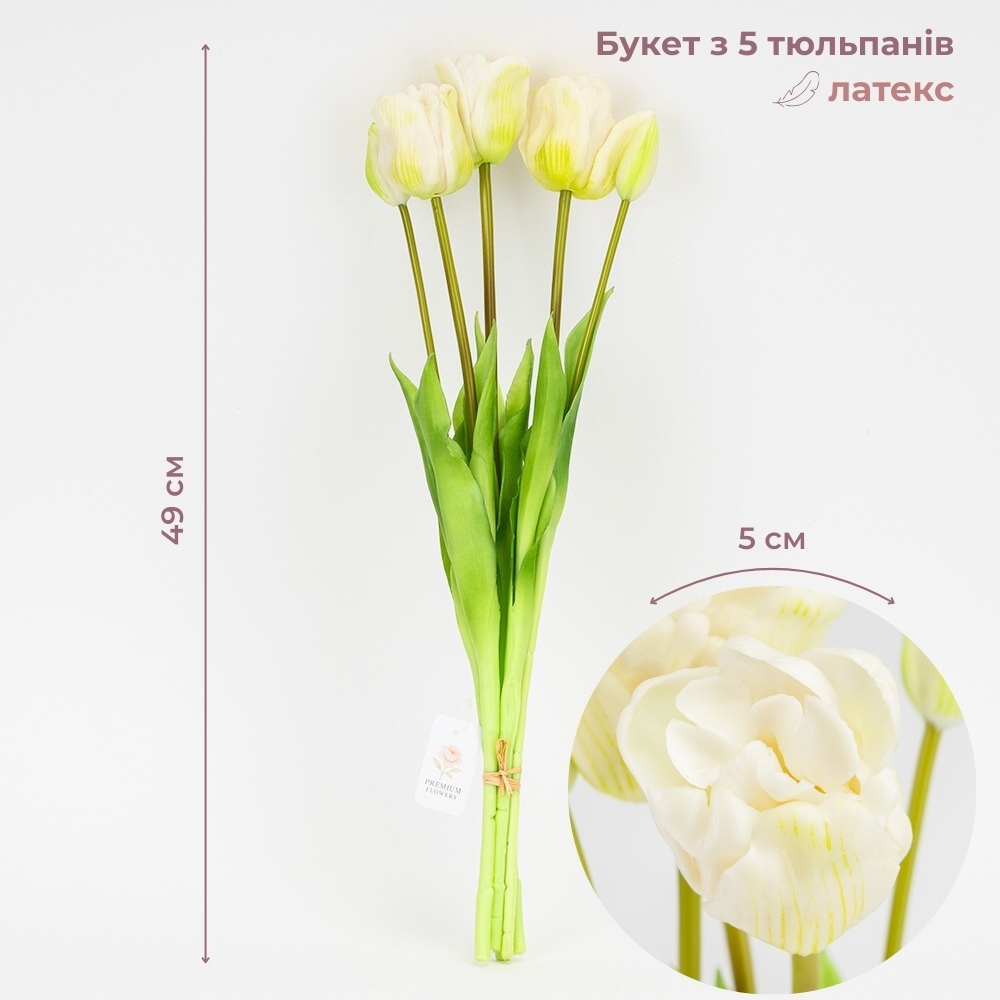 Букет з 5 тюльпанів. Висота букету — 49 см, діаметр бутону — 5 см. Виготовлений з латексу. Букет тюльпанів з латексу — витончена композиція, що вражає своєю неповторною красою та реалістичністю, відтворюючи живі квіти з великою деталізацією. Такий букет є ідеальним варіантом для створення декоративних композицій, декорування святкових заходів, фотостудій, вітрин магазинів, кафе тощо! Букет залишиться свіжим та привабливим протягом тривалого часу без надмірного догляду.