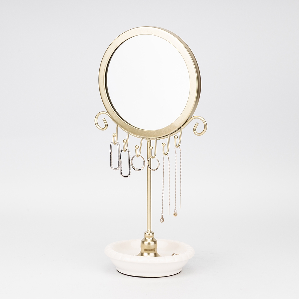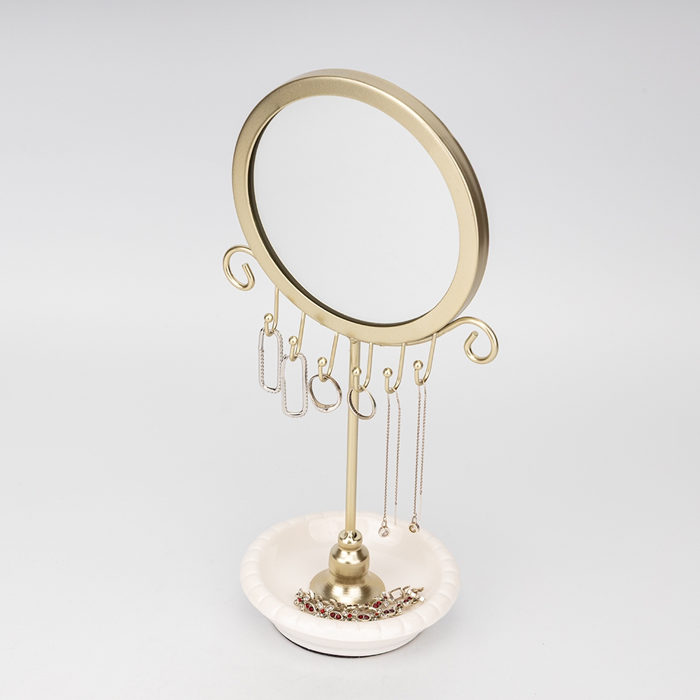 Висота — 32,5 см, діаметр — 12 см. Елегантна металева підставка з дзеркалом — це стильне поєднання функціональності та розкоші для туалетного столика. Золотиста рама обладнана спеціальними гачками для зручного розвішування сережок, каблучок та ланцюжків. В основі розташована вишукана керамічна чаша, яка ідеально підходить для зберігання дрібних аксесуарів. Завдяки міцному металевому корпусу та витонченому дизайну, органайзер забезпечує порядок і стає яскравим акцентом в інтер'єрі.