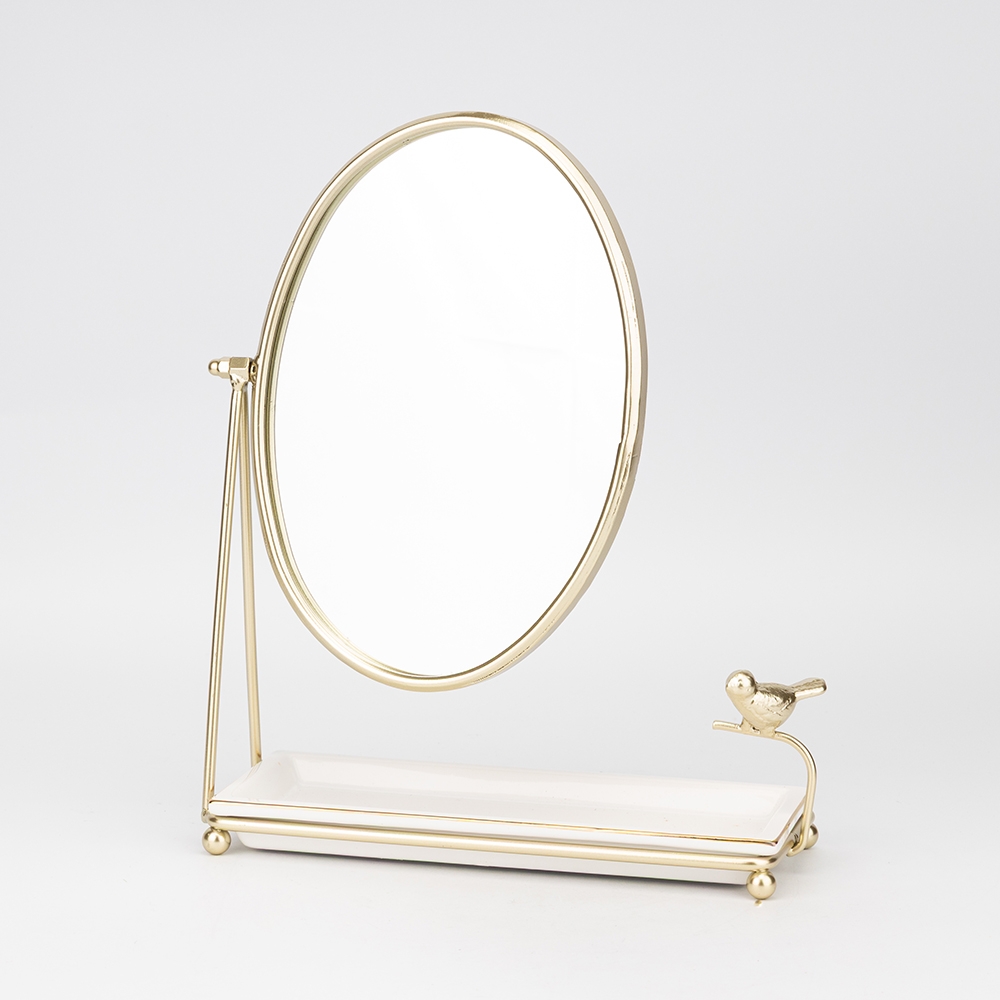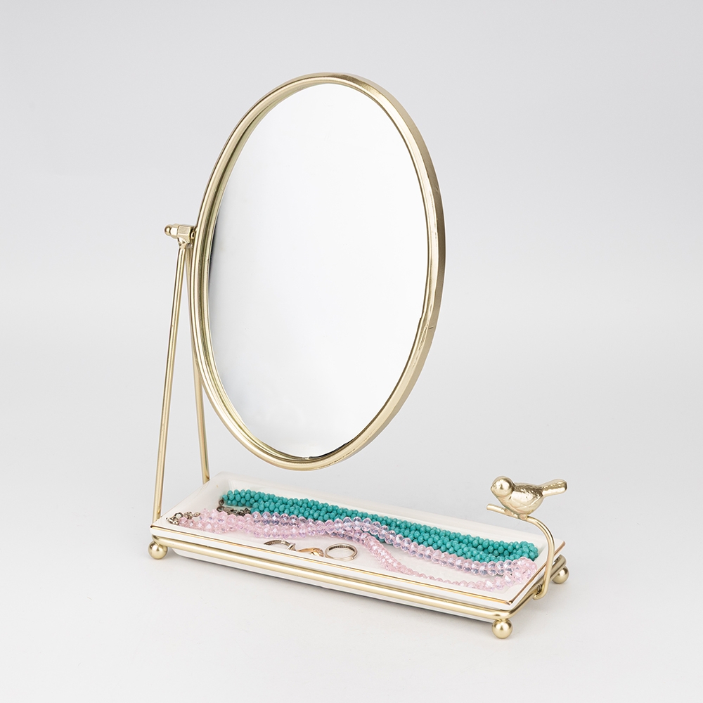 Висота — 30 см, довжина — 23 см, ширина — 9,5 см. Розмір дзеркала — 22*16 см. Ця елегантна настільна металева підставка — ідеальне поєднання стилю та функціональності для туалетного столика. Вона оснащена зручним дзеркалом в овальному обрамленні та невеликою керамічною тацею для зберігання каблучок, сережок чи косметики. Особливого шарму дизайну додає витончена фігурка пташки, що робить виріб справжньою окрасою інтер'єру. Міцна металева конструкція золотистого кольору забезпечує стійкість та довговічність аксесуара. Такий органайзер допоможе тримати улюблені прикраси під рукою та щодня створюватиме особливий настрій.
