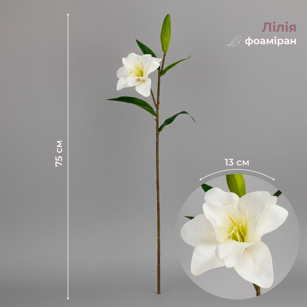 Висота — 75 см. Діаметр бутона — 13 см. Матеріал квітки — фоаміран, листя — тканина. Лілія — елегантний акцент для інтер’єрного та святкового декору з реалістичною формою квітки та акуратним листям. Чудово виглядає як соло у вазі, так і в складі квіткових композицій. Підходить для оформлення фотозон, вітрин і декору подій.