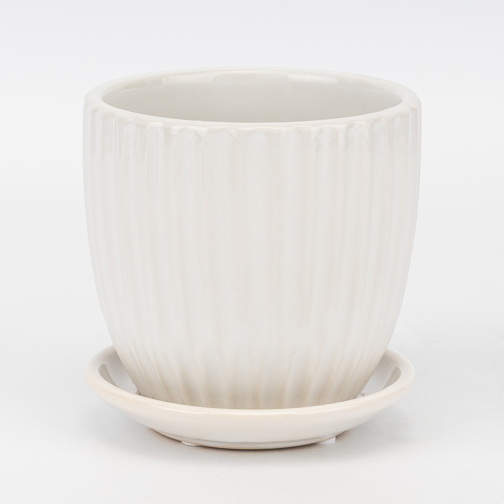 Висота — 12 см, діаметр — 12 см. Об'єм — 1 л. Піддон є невід’ємною частиною кашпо, міцно прикріплений до основи! Спеціальний дренажний отвір у дні дозволяє відводити зайву вологу, підтримуючи оптимальний водний баланс для здорового росту рослин. Керамічне кашпо — стильний та практичний елемент декору, який ідеально доповнить інтер’єр. Завдяки продуманому дизайну та приємним натуральним відтінкам воно гармонійно поєднується з будь-яким стилем — від мінімалізму до скандинавського чи класичного. Кашпо виготовлене з високоякісної кераміки, що забезпечує його довговічність, стійкість та охайний вигляд протягом багатьох років. Форма з рельєфом додає виробу текстури та вишуканості, а гладке глянцеве покриття створює елегантний акцент у просторі.
