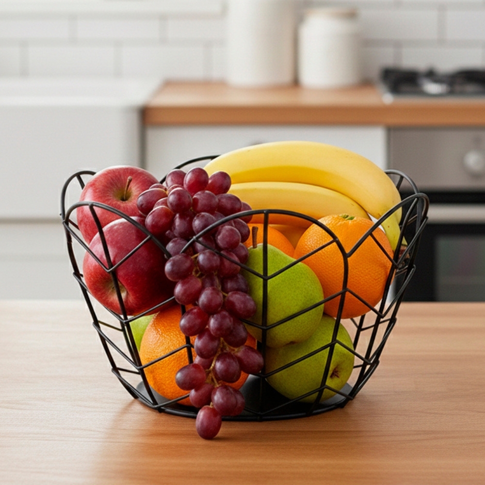 Діаметр — 23 см, висота — 16 см. Фруктівниця металева «Ейра» — стильний елемент для сервірування та інтер’єрного декору, який поєднує практичність і сучасний дизайн. Лаконічна форма з металевих ліній забезпечує зручне розміщення фруктів і гарну вентиляцію, зберігаючи їх свіжість. Така фруктівниця гармонійно виглядає на кухонному столі, у вітрині, ресторані або кав’ярні та підходить для оформлення просторів у стилі модерн, лофт і мінімалізм. Вдалий вибір для дому, HoReCa та декоративного сервірування.