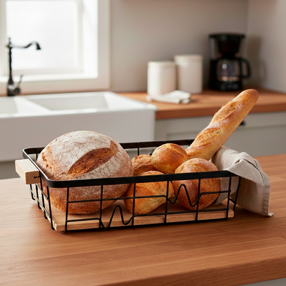 Ширина — 32,5 см, довжина — 20 см, висота — 9 см. Металева хлібниця «Лофт» — практичний і стильний аксесуар для зберігання хліба та випічки на кухні. Лаконічний дизайн і відкрита конструкція сприяють циркуляції повітря, що допомагає довше зберігати свіжість хлібобулочних виробів. Хлібниця гармонійно доповнює сучасні, індустріальні та мінімалістичні інтер’єри, підходить для домашнього використання, кав’ярень і закладів HoReCa. Вдале поєднання функціональності та декоративної естетики для щоденного користування.