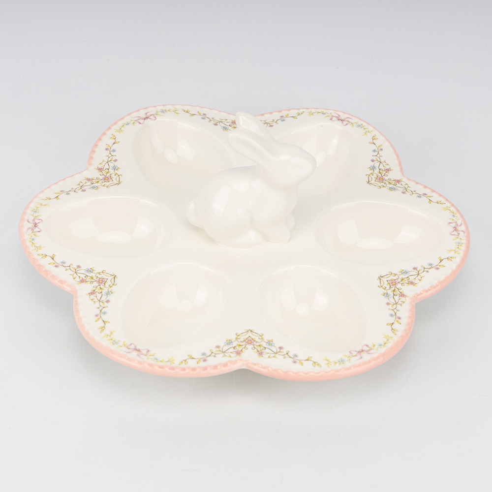 Діаметр підставки — 25 см, ємності для яйця — 5,5 см. Висота — 9 см. Розрахована на 6 яєць. Керамічна підставка у формі квітки зі стильним орнаментом і центральним кроликом — чудове рішення для святкового сервірування. Вона виглядає ніжно, легко та дуже святково, створюючи красивий акцент на столі.