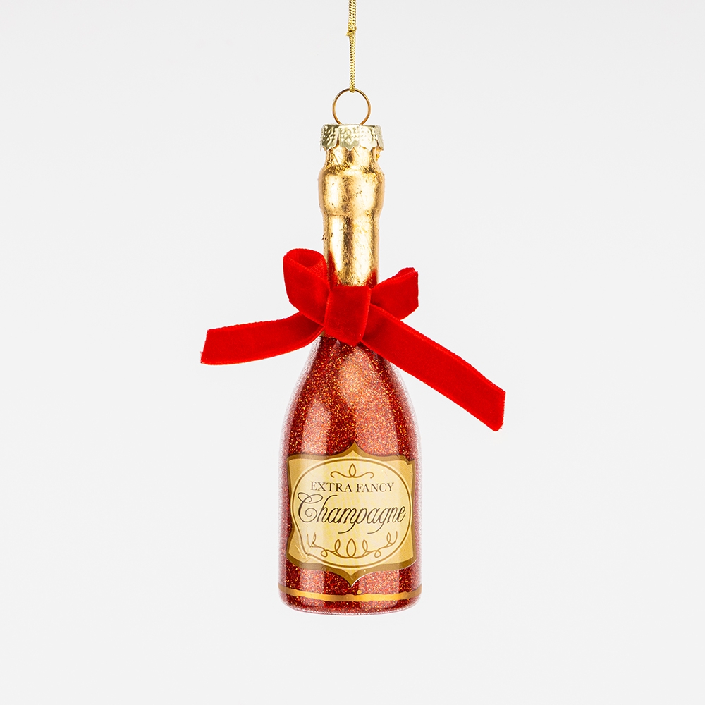 Зверніть увагу, що внаслідок недавньої атаки дронів частина партії цього товару має пошкоджене оригінальне пакування. Також присутній аромат гарі, який повністю вивітрюється протягом деякого часу. Висота іграшки — 12,5 см, ширина — 3,7 см. Ця гламурна скляна ялинкова іграшка має форму пляшки шампанського, прикрашена витонченою етикеткою "Extra Fancy Champagne" та елегантним червоним оксамитовим бантом. Вона стане сміливим, яскравим та урочистим акцентом у вашому новорічному декорі. Цей декор ідеально підійде для створення святкової атмосфери та додасть нотку розкоші вашій ялинці.