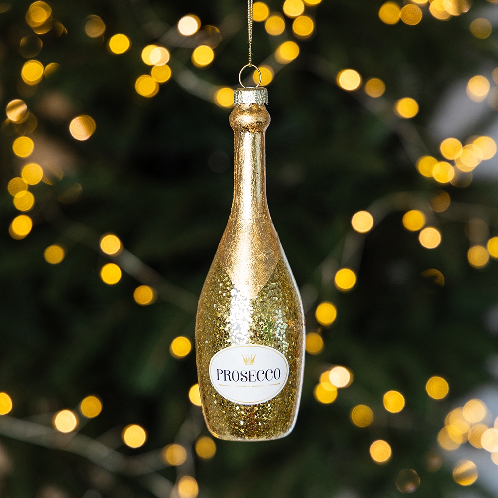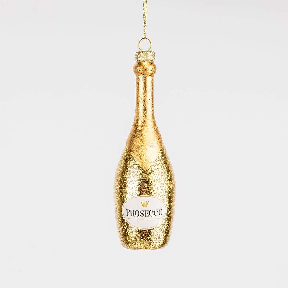 Зверніть увагу, що внаслідок недавньої атаки дронів частина партії цього товару має пошкоджене оригінальне пакування. Також присутній аромат гарі, який повністю вивітрюється протягом деякого часу. Висота іграшки — 14,5 см, ширина — 4,5 см. Ця елегантна скляна ялинкова іграшка має форму пляшки популярного італійського ігристого вина Prosecco. Верхня частина пляшки виконана в золотистому кольорі, а нижня наповнена яскравим золотим глітером, що імітує святкові бульбашки та забезпечує ефектне сяйво. Іграшка є модним та святковим аксесуаром, який принесе на вашу ялинку атмосферу італійської розкоші та безтурботності.