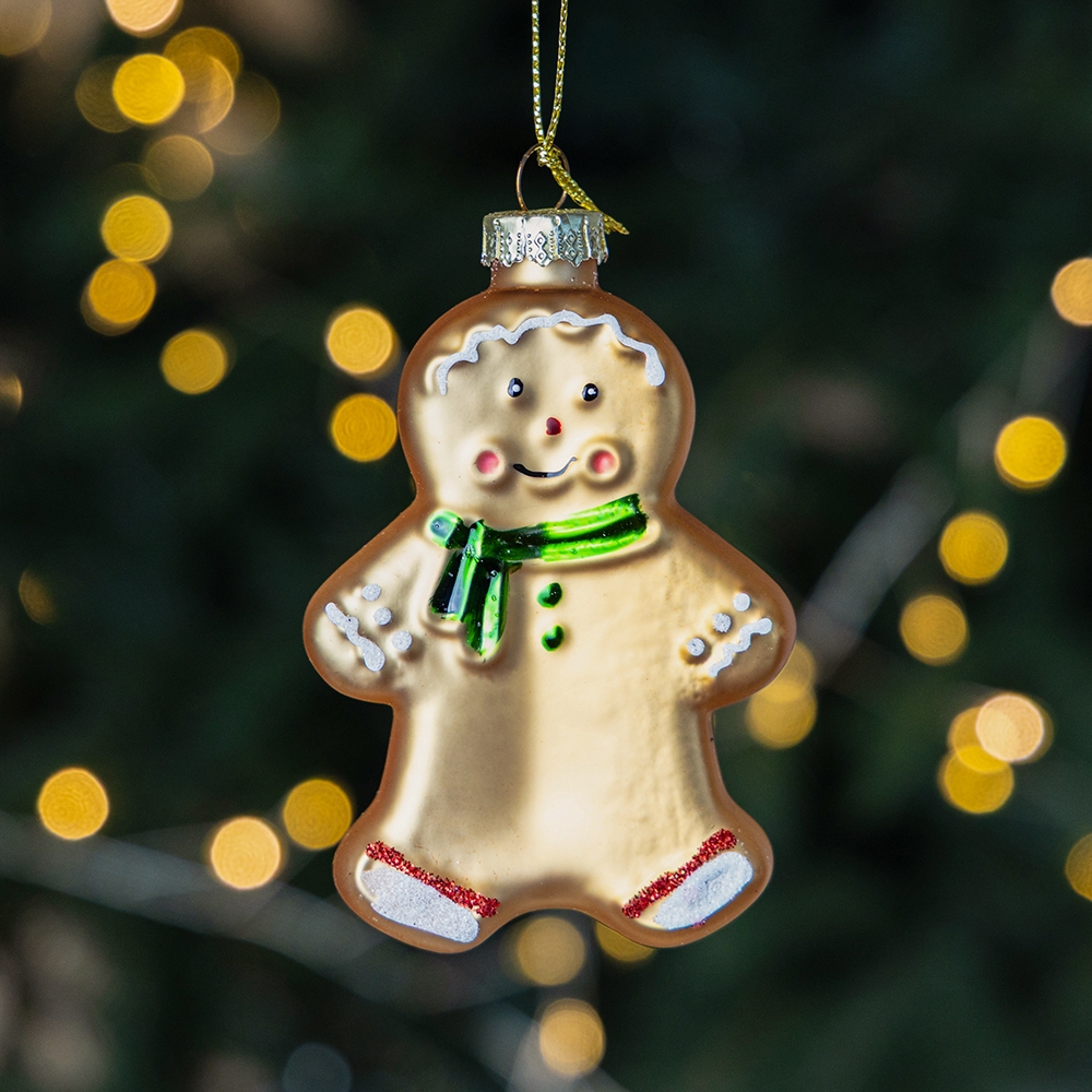 Зверніть увагу, що внаслідок недавньої атаки дронів частина партії цього товару має пошкоджене оригінальне пакування. Також присутній аромат гарі, який повністю вивітрюється протягом деякого часу. Висота іграшки — 10 см, довжина — 6,5 см, ширина — 2,3 см. Ця мила скляна ялинкова іграшка виконана у формі різдвяного імбирного чоловічка, що символізує затишок, домашнє тепло та святкові традиції. Іграшка має теплий золотисто-коричневий колір та прикрашена яскраво-зеленим шарфом і деталями, що імітують білу глазур. Вона додасть вашій ялинці грайливий, традиційний та надзвичайно чарівний акцент.