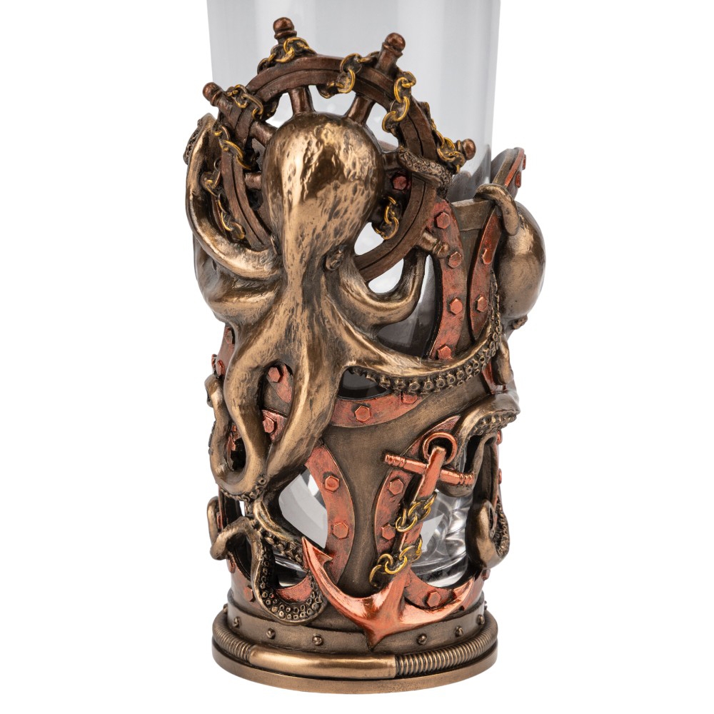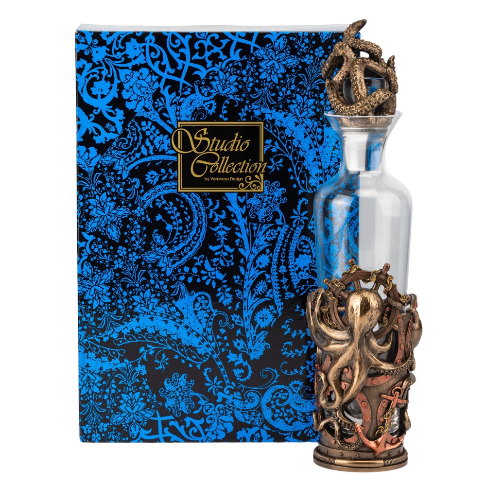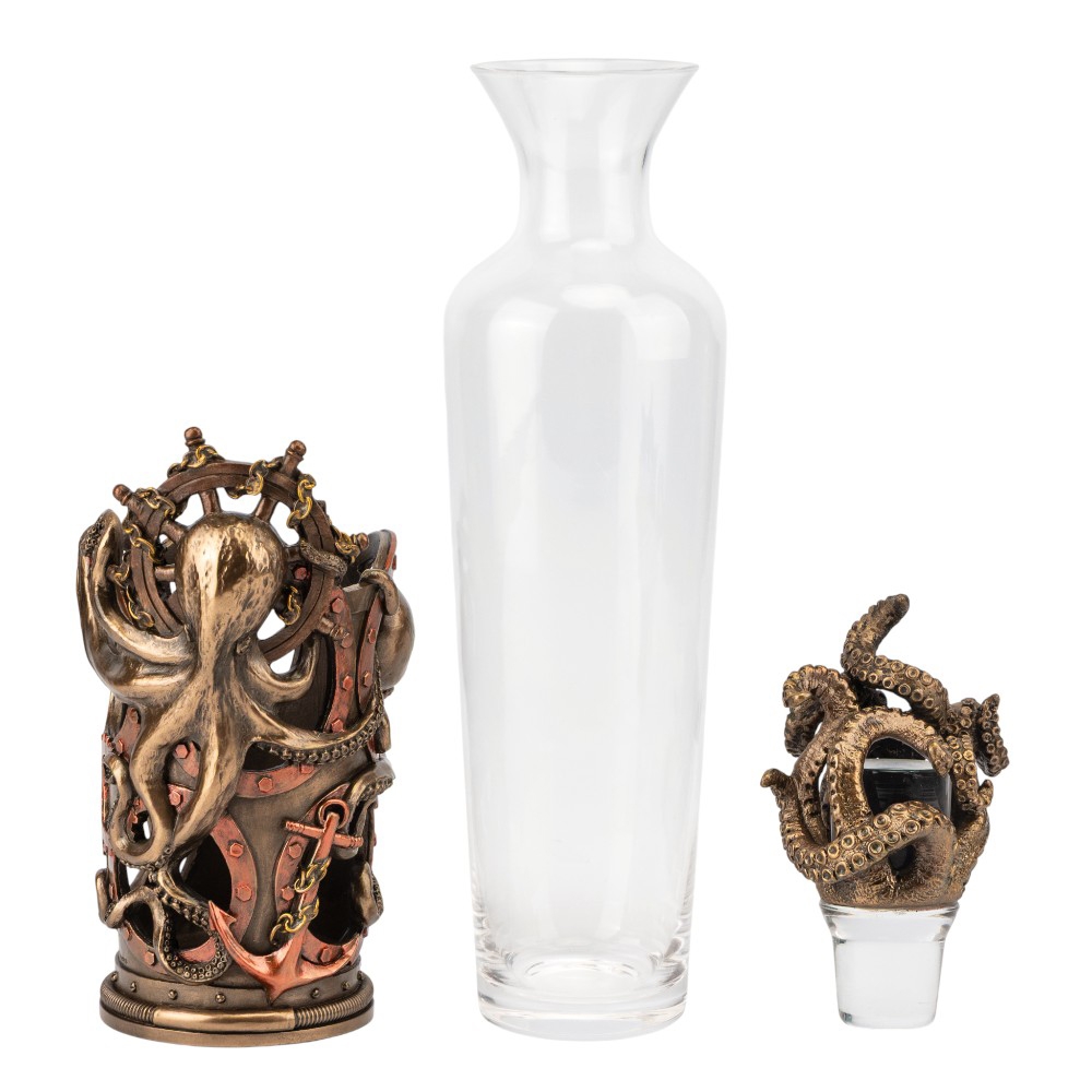 Об'єм — 1000 мл. Висота — 40 см, діаметр — 9 см. Запакований в подарункову коробку. Упаковка з пінопласту з індивідуальними поглибленнями для кожного елемента забезпечує максимальний захист товару під час транспортування. Цей унікальний декантер об'ємом 1000 мл поєднує функціональність та містичну морську естетику в стилі Steampunk. Графін прикрашений деталізованим декоративним футляром у вигляді восьминога, який обплітає штурвал та корабельні якорі, виконаний під стару мідь і бронзу. Горловина графина має корок-затичку у формі щупалець, що підкреслює роль восьминога як "Морського Вартового" вашого напою. Це ідеальний та ексклюзивний подарунок для цінителів рідкісних напоїв, колекціонерів, а також прихильників морської тематики та стилю Steampunk. Набір стане справжньою окрасою домашнього бару, кабінету або оригінальною вітриною для віскі чи рому.