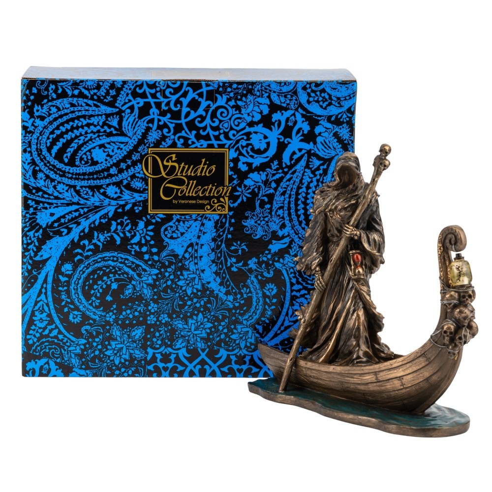 Висота статуетки — 25 см, довжина — 26, ширина — 10 см. Статуетка Veronese виготовлена з полістоуну — штучного каменю. Запакована в подарункову коробку. Упаковка з пінопласту з індивідуальними поглибленнями для кожного елемента забезпечує максимальний захист товару під час транспортування. Ця фігура уособлює таємницю переходу між світами — легендарний Харон, перевізник душ через річку Стикс. Деталізація бронзового покриття передає кожну складку плаща, старовинний човен і моторошні символи смерті. Пісочний годинник у його руці нагадує про швидкоплинність часу, а темна вода під човном — про вічну подорож у невідомість. Статуетка стане символом філософського осмислення життя, сили долі та неминучості часу.