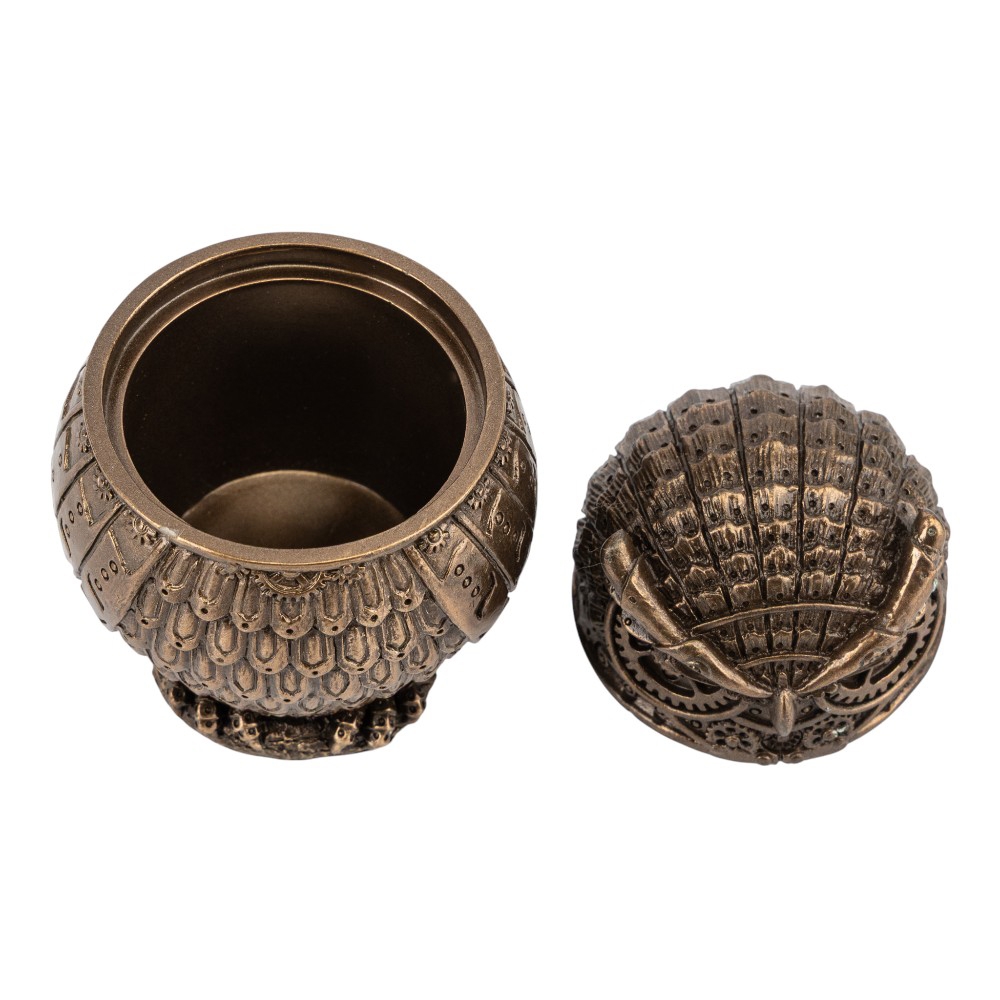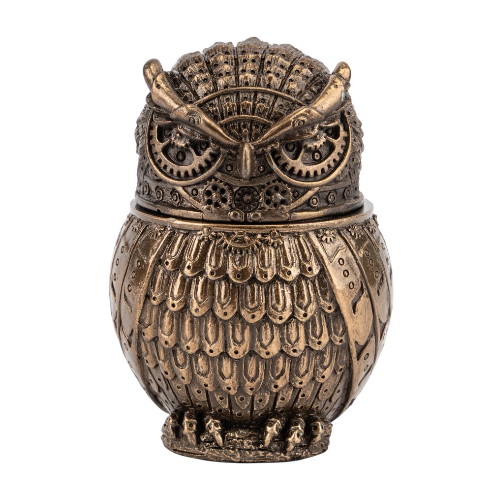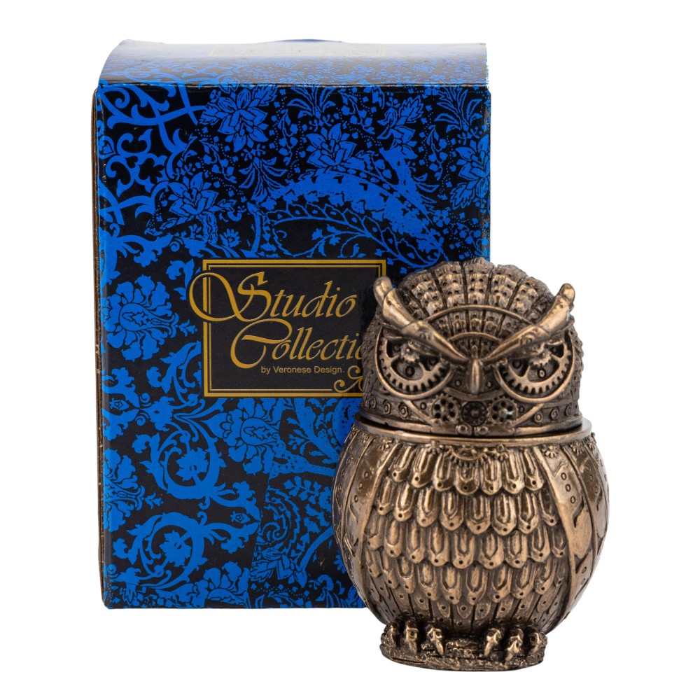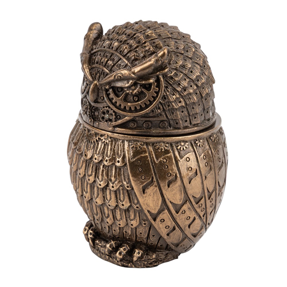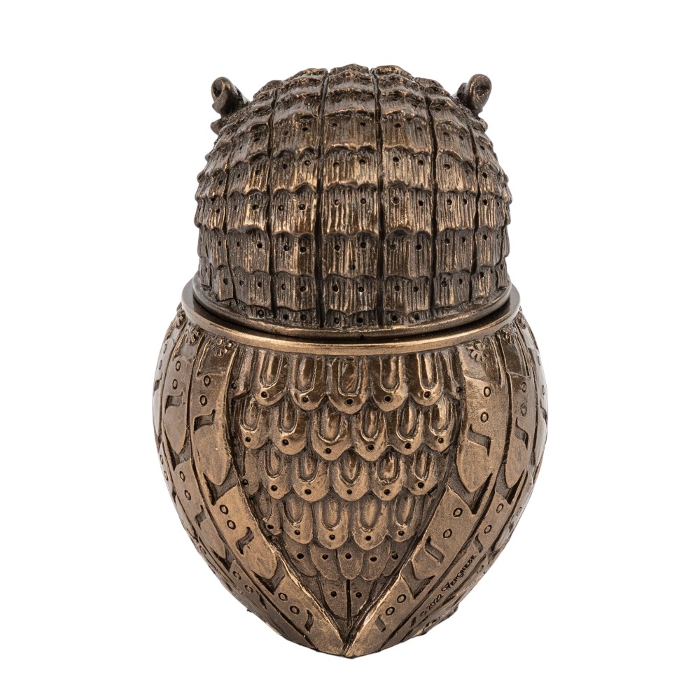 Висота — 8 см, ширина — 5,5 см. Скринька Veronese виготовлена з полістоуну — штучного каменю. Запакована в подарункову коробку. Упаковка з пінопласту з індивідуальними поглибленнями для кожного елемента забезпечує максимальний захист товару під час транспортування. Вишукана шкатулка у формі сови поєднує символ мудрості з практичністю та естетикою. Її бронзове покриття з деталізованим оперенням створює відчуття старовинного артефакту, а прихований усередині простір ідеально підходить для зберігання прикрас, дрібниць або пам’ятних речей. Витончена форма, продумане оздоблення та глибокий символізм роблять цю шкатулку не лише оригінальною прикрасою інтер’єру, а й чудовим подарунком для тих, хто цінує гармонію краси й сенсу.