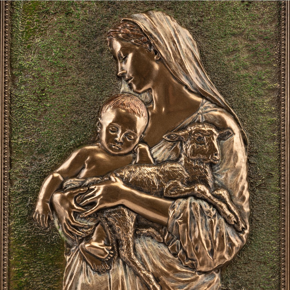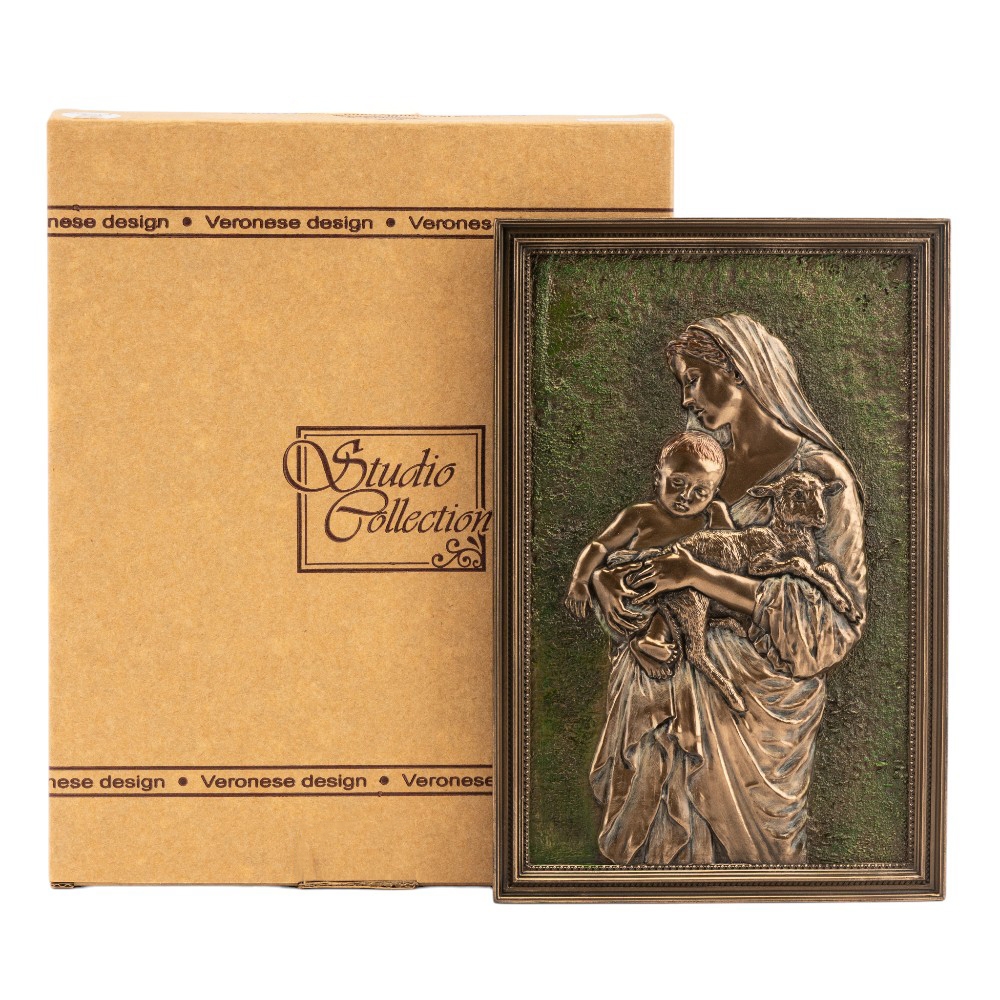Висота — 23 см, довжина — 15 см, ширина — 1,5 см. Картина Veronese виготовлена з полістоуну — штучного каменю. Запакована в подарункову коробку. Упаковка з пінопласту з індивідуальними поглибленнями для кожного елемента забезпечує максимальний захист товару під час транспортування. Цей величний панно-барельєф від Veronese є класичним відтворенням сцени Мадонни з Дитиною. Композиція зображує Діву Марію, яка ніжно тримає немовля Ісуса та Агнця Божого, що символізує чистоту, невинність та жертовну любов. Об'ємний рельєф виконаний із полістоуну з деталізованим бронзовим напиленням і поміщений у витончену рамку, а мохове тло додає композиції глибини та природності. Завдяки надійному кріпленню та підставці, виріб можна як повісити на стіну, так і розмістити на столі чи полиці. Це ідеальний та знаковий подарунок для хрестин, весілля чи новосілля, який слугує потужним оберегом для родини.