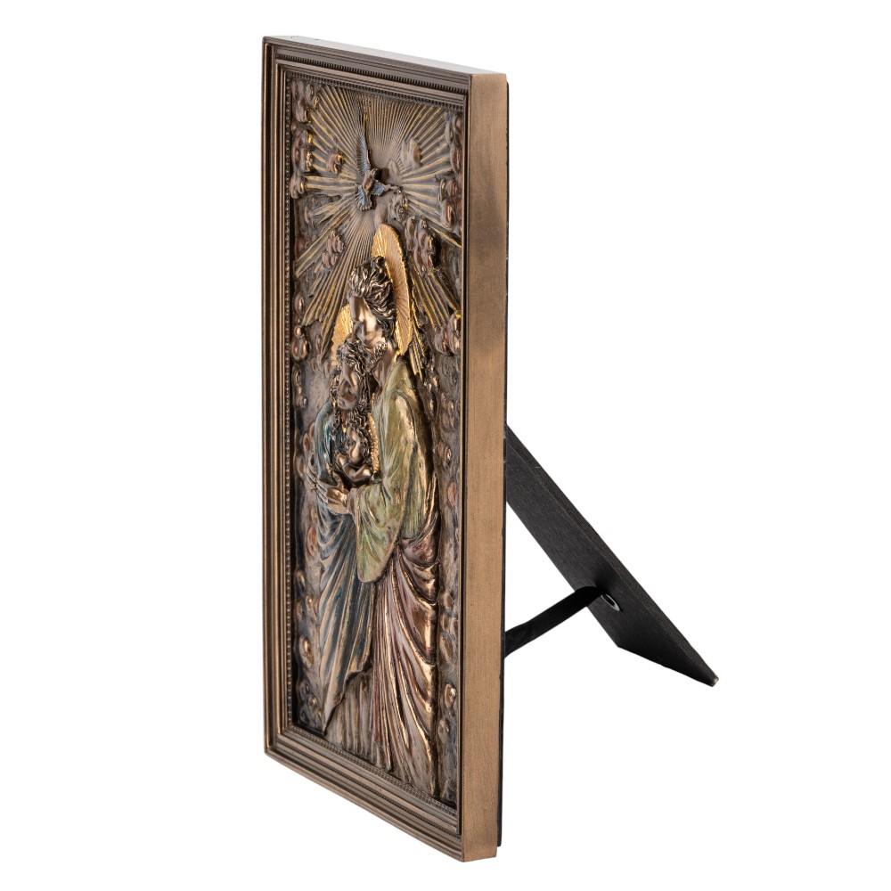 Висота — 23 см, довжина — 15 см, ширина — 1,5 см. Картина Veronese виготовлена з полістоуну — штучного каменю. Запакована в подарункову коробку. Упаковка з пінопласту з індивідуальними поглибленнями для кожного елемента забезпечує максимальний захист товару під час транспортування. Це величне настінне панно-барельєф від Veronese є зворушливим зображенням Святої Родини — Ісуса, Марії та Йосипа, об'єднаних у теплій обіймі. Композиція майстерно передає ідеал сімейної любові та захисту, підкреслений німбами та символом Святого Духа (голубом) у променях світла. Барельєф виконаний із полістоуну і покритий високоякісним бронзовим напиленням із кольоровими акцентами, що робить його винятково живим. Завдяки об'ємному виконанню та вишуканій рамці, панно виглядає як справжній витвір мистецтва на стіні. Це знаковий подарунок для молодої родини, на хрестини, весілля або як потужний оберіг для сімейного благополуччя.