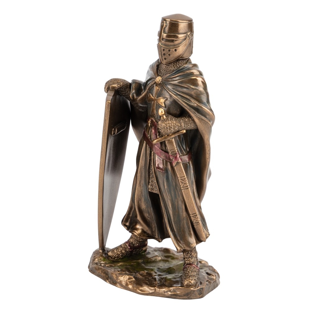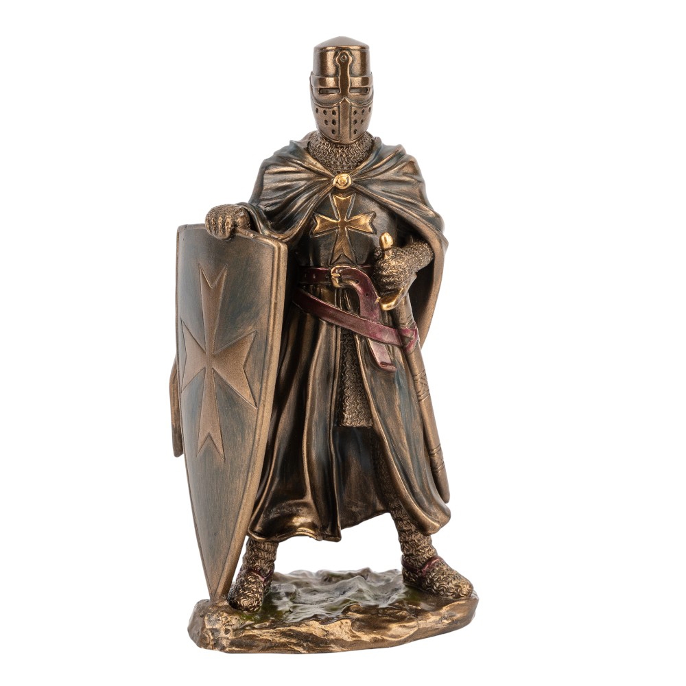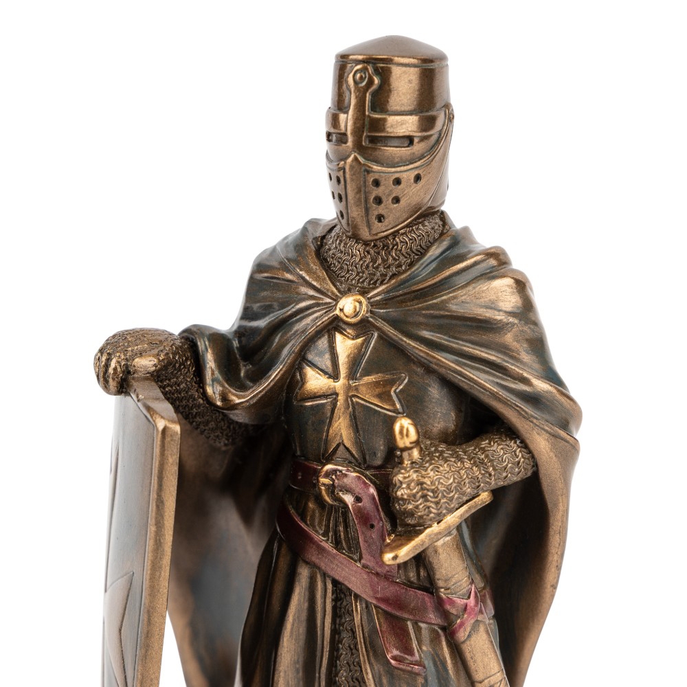Висота статуетки — 15,5 см, ширина — 7 см. Статуетка Veronese виготовлена з полістоуну — штучного каменю. Запакована в подарункову коробку. Упаковка з пінопласту з індивідуальними поглибленнями для кожного елемента забезпечує максимальний захист товару під час транспортування. Ця статуетка від Veronese втілює образ Лицаря-Хрестоносця — символ духовної сили та військової мужності Середньовіччя. Фігура зображена у повних латах і довгій накидці, яка надає образу таємничості та величі. Лицар стоїть, притуливши до себе великий щит, прикрашений хрестом, що символізує його незламну віру та готовність до захисту. Скульптура виконана з полістоуну з високоякісним бронзовим напиленням, яке детально передає фактуру кольчуги та лат. Це винятковий подарунок для колекціонерів, істориків та всіх, хто цінує символи непохитності, честі та вірності своїм ідеалам.