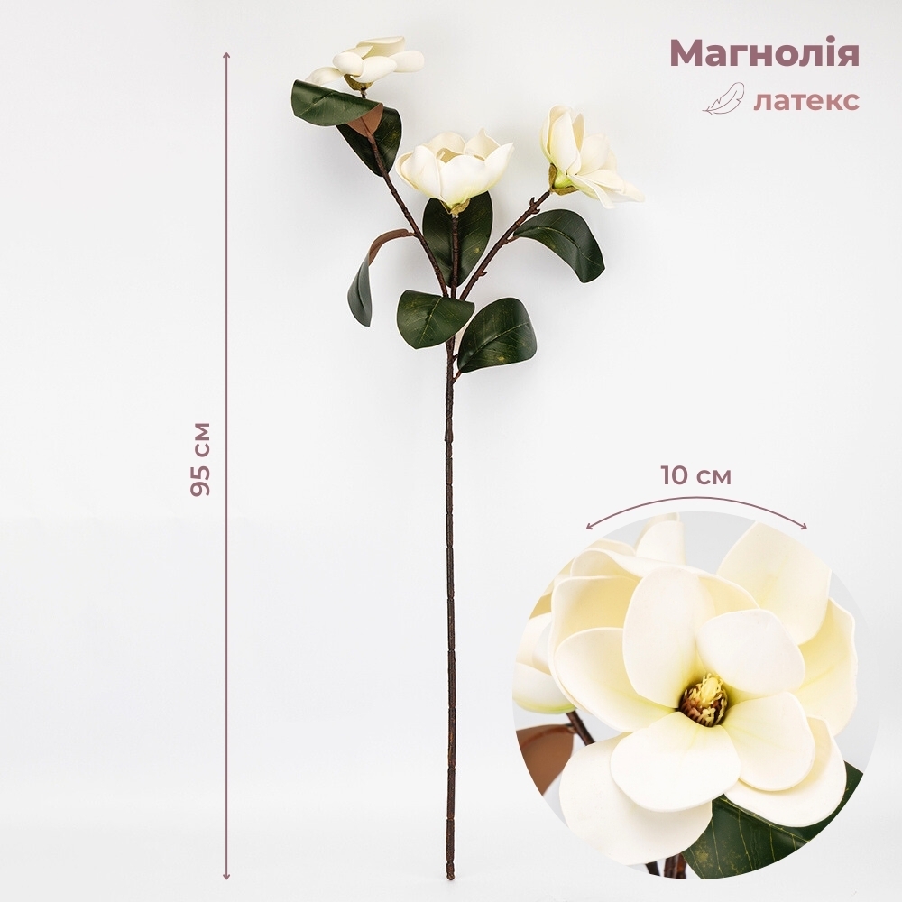 Зверніть увагу, що внаслідок недавньої атаки дронів частина партії має незначний аромат гарі, який повністю вивітрюється протягом короткого часу.Висота — 95 см, діаметр найбільшого бутона — 10 см. Латексна магнолія — це ідеальне рішення для створення вишуканих та довговічних флористичних композицій. Завдяки реалістичному покриттю пелюсток та деталізованій структурі бутонів, квітка не відрізняється від живої. Витончена гілка має додаткове стильне темно-коричневе листя, що додає об'єму та природності. Ця штучна магнолія не потребує догляду та збереже свій первісний вигляд протягом багатьох років. Створіть атмосферу весняного саду у вашому інтер'єрі вже сьогодні.