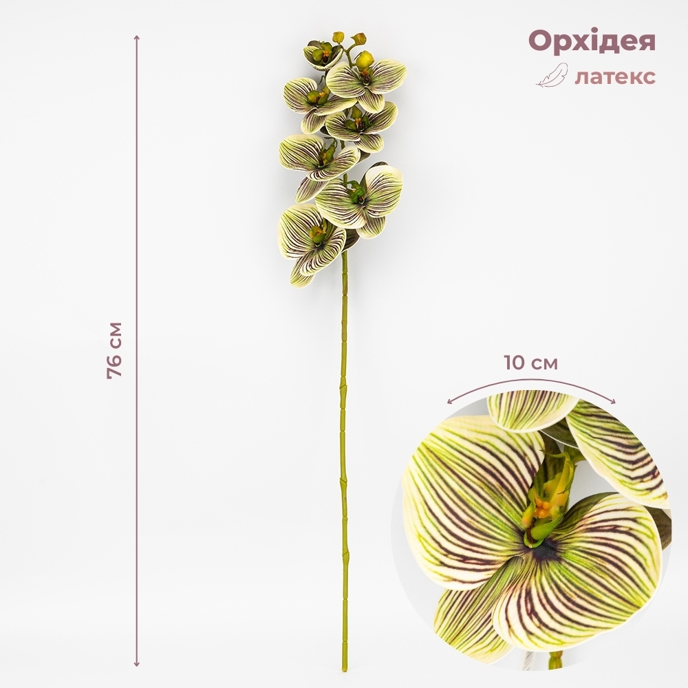 Зверніть увагу, що внаслідок недавньої атаки дронів частина партії має незначний аромат гарі, який повністю вивітрюється протягом короткого часу.Висота — 76 см, діаметр бутонів — 10 см. Квіти виконані з латексу, стебла - з пластику. Штучна гілка орхідеї з витонченими пелюстками та реалістичними бутонами додає елегантності будь-якому інтер’єру. Квітка має граційні вигини та деталізовану текстуру, що максимально наближена до живої рослини. Ідеально підходить для декору вітрин, ресторанів чи фотозон.