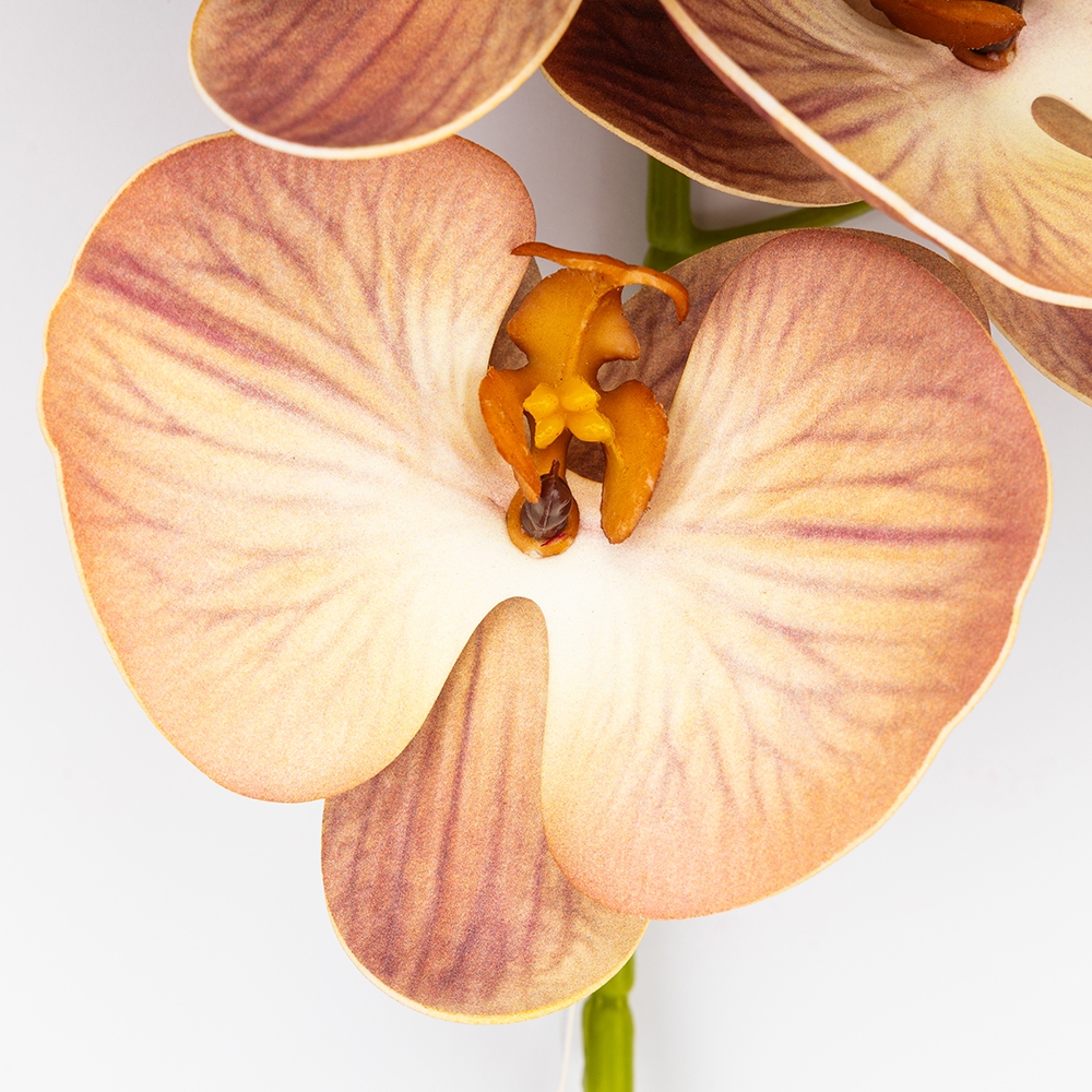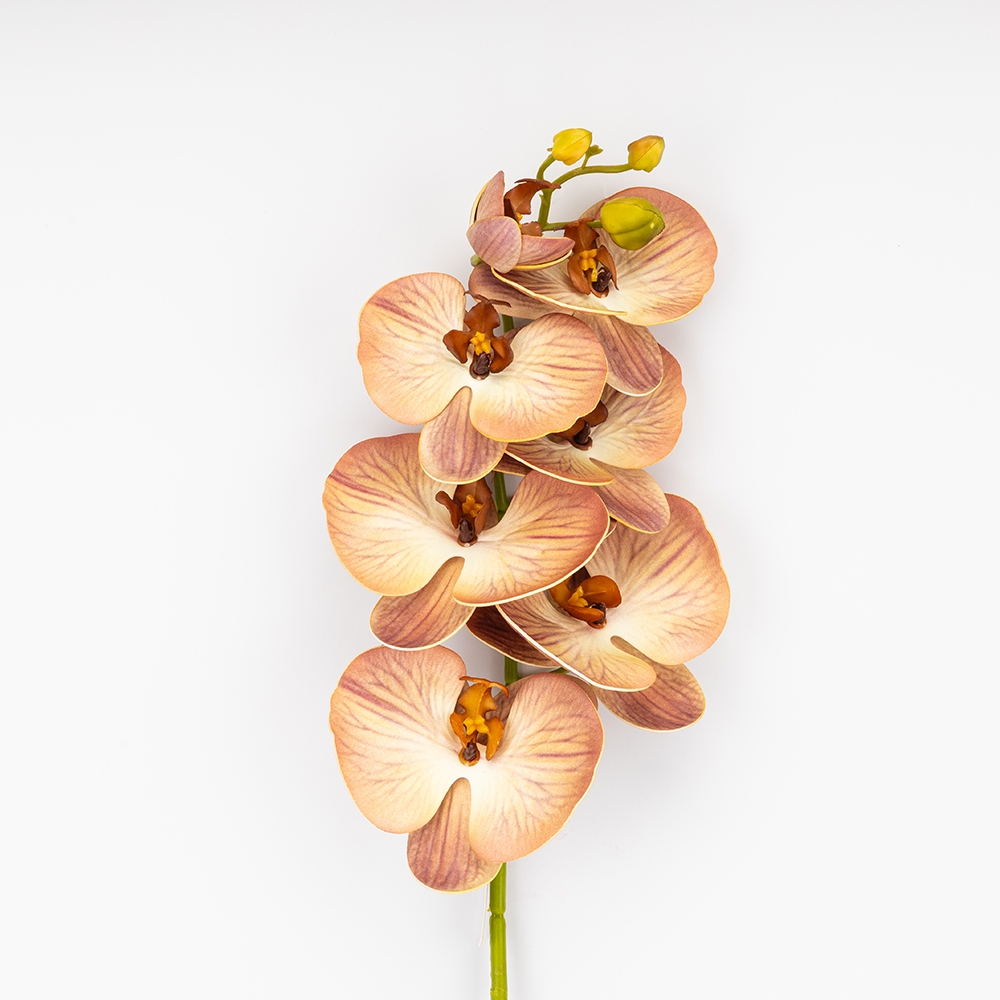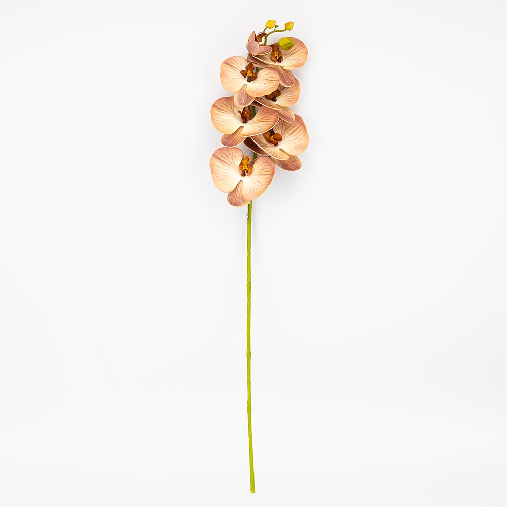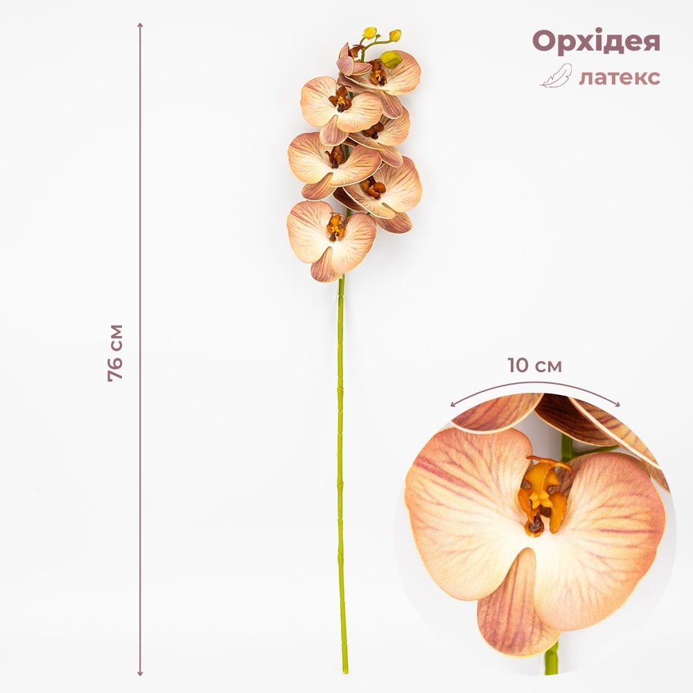 Зверніть увагу, що внаслідок недавньої атаки дронів частина партії має незначний аромат гарі, який повністю вивітрюється протягом короткого часу.Висота — 76 см, діаметр бутонів — 10 см. Квіти виконані з латексу, стебла - з пластику. Штучна гілка орхідеї з витонченими пелюстками та реалістичними бутонами додає елегантності будь-якому інтер’єру. Квітка має граційні вигини та деталізовану текстуру, що максимально наближена до живої рослини. Ідеально підходить для декору вітрин, ресторанів чи фотозон.