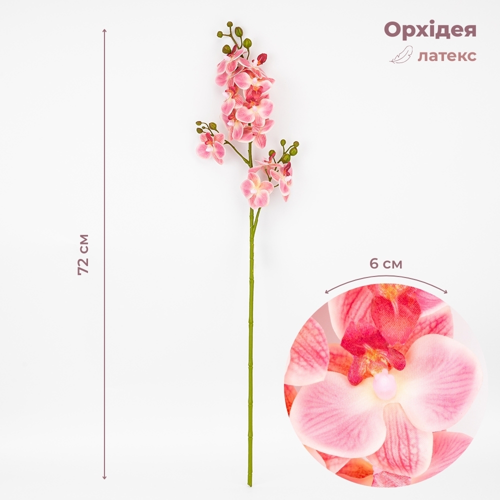 Зверніть увагу, що внаслідок недавньої атаки дронів частина партії має незначний аромат гарі, який повністю вивітрюється протягом короткого часу.Висота — 72 см, діаметр бутонів — 6 см. Квіти виконані з латексу, стебла - з пластику. Штучна гілка орхідеї з витонченими пелюстками та реалістичними бутонами додає елегантності будь-якому інтер’єру. Квітка має граційні вигини та деталізовану текстуру, що максимально наближена до живої рослини. Ідеально підходить для декору вітрин, ресторанів чи фотозон.