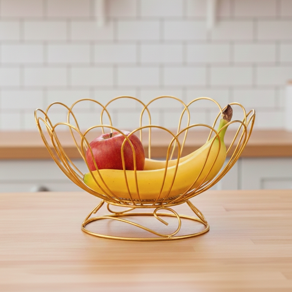 Зверніть увагу, що внаслідок недавньої атаки дронів частина партії має незначний аромат гарі, який повністю вивітрюється протягом короткого часу. Діаметр - 26 см. Металева фруктівниця виповнена у сучасному мінімалістичному стилі. Це не тільки практична річ, а й витончений елемент декору. Золотий вишуканий дизайн виглядатиме ідеально на будь-якій кухні, у кафе чи фотостудії. Відмінний варіант для зберігання фруктів, овочів, цукерок тощо.