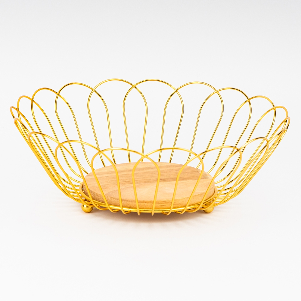 Зверніть увагу, що внаслідок недавньої атаки дронів частина партії має незначний аромат гарі, який повністю вивітрюється протягом короткого часу. Діаметр - 29 см. Висота - 10 см. Ця фруктовниця поєднує вишуканий дизайн із практичністю, створюючи яскравий акцент на столі. Її каркас виготовлений із тонкого металевого дроту із блискучим золотистим покриттям, що формує елегантний візерунок, схожий на пелюстки соняшника. У центрі розташована кругла дерев'яна вставка світлого відтінку, яка забезпечує стійку основу для фруктів і додає теплий, натуральний контраст до блиску металу. Кошик стоїть на невеликих металевих ніжках, які захищають поверхню. Це ідеальний декоративний аксесуар для стильного сервірування столу та зручного зберігання фруктів.