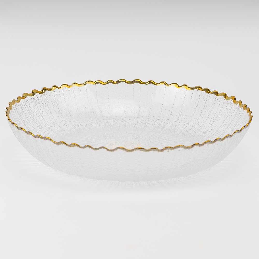 Зверніть увагу, що внаслідок недавньої атаки дронів частина партії має незначний аромат гарі, який повністю вивітрюється протягом короткого часу. Діаметр - 33 см, висота - 6,5 см. Вишукане блюдо поєднує елегантність і сучасний стиль. Скло з хвилястими краями та витонченою окантовкою створює ефект розкішного сервірування. Таке блюдо стане акцентом святкового столу або доповненням до інтер’єру кафе чи ресторану. Ідеально підходить для подачі фруктів, десертів або закусок.