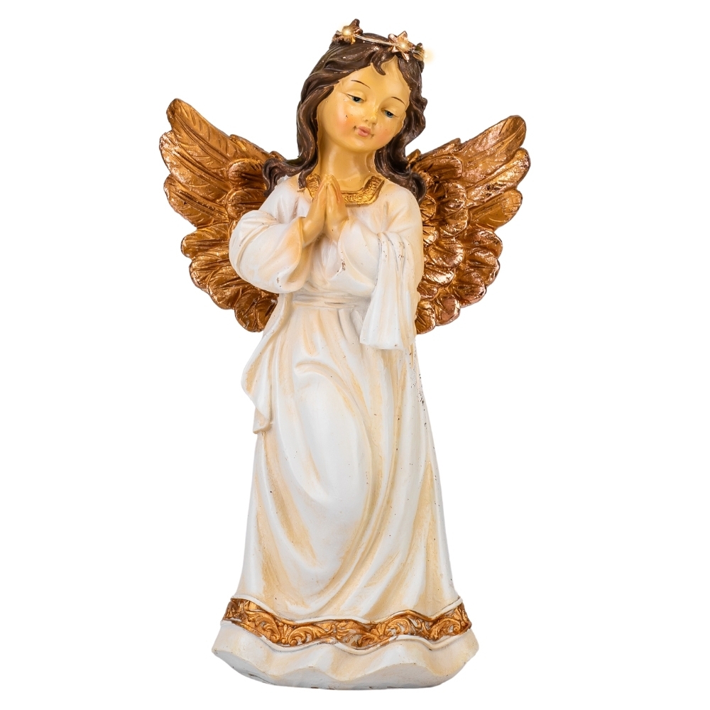 Статуэтка с подсветкой "Духовное Озарение" - это изящная и символическая фигура, высотой 31,5 см, изготовленная из полистоуна, что придает ей прочность и долговечность. Ангел изображен с нежными золотыми крыльями, придающими фигуре элегантности и подчеркивающим ее небесную сущность. На голове ангела венок с подсветкой, который нежно светится благодаря встроенному освещению, работающему от 2 батареек типа AAA. Подсветка создает мягкое сияние, наполняющее пространство уютом и гармонией. Эта статуэтка станет символом мира, света и духовной силы в вашем доме или станет прекрасным подарком, несущим в себе послание любви и небесной поддержки. Она идеально подходит для праздничного или обыденного декора, подчеркивая важность гармонии и света в душе.