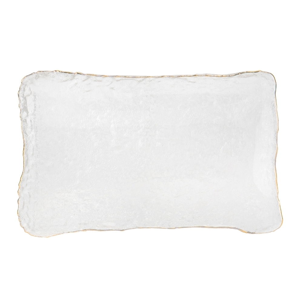 Длина – 23 см, ширина – 14 см, высота – 2 см. Стеклянное блюдо изящной прямоугольной формы с эффектом ручной работы. Оно выполнено из стекла высокого качества, что обеспечивает его прозрачность и прочность. Легкий рельеф на поверхности создает изысканную текстуру, а неровный край с золотой отделкой придает блюду особый шарм. Благодаря универсальному дизайну, такое блюдо станет идеальным выбором для сервировки закусок, десертов, суши или фруктов. Оно гармонично впишется как в праздничную, так и в повседневную сервировку, добавляя нотку роскоши любому столу.