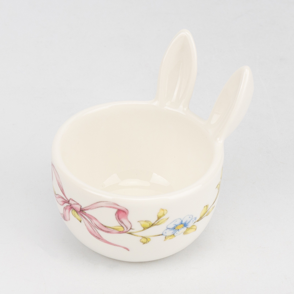 Диаметр – 6 см, высота – 6 см. Керамическая подставка под яйцо – нежный праздничный акцент, который сделает пасхальный стол особенным. Дизайн в форме кролика с милыми ушками в сочетании с нежной росписью цветов и розовых бантов создает атмосферу весеннего уюта. Высокое качество исполнения и глянцевый блеск делают его не просто посудой, а настоящим украшением пасхальной сервировки. Такой аксессуар станет идеальным подарком для тех, кто ценит эстетику в деталях и стремится создать незабываемое праздничное настроение.