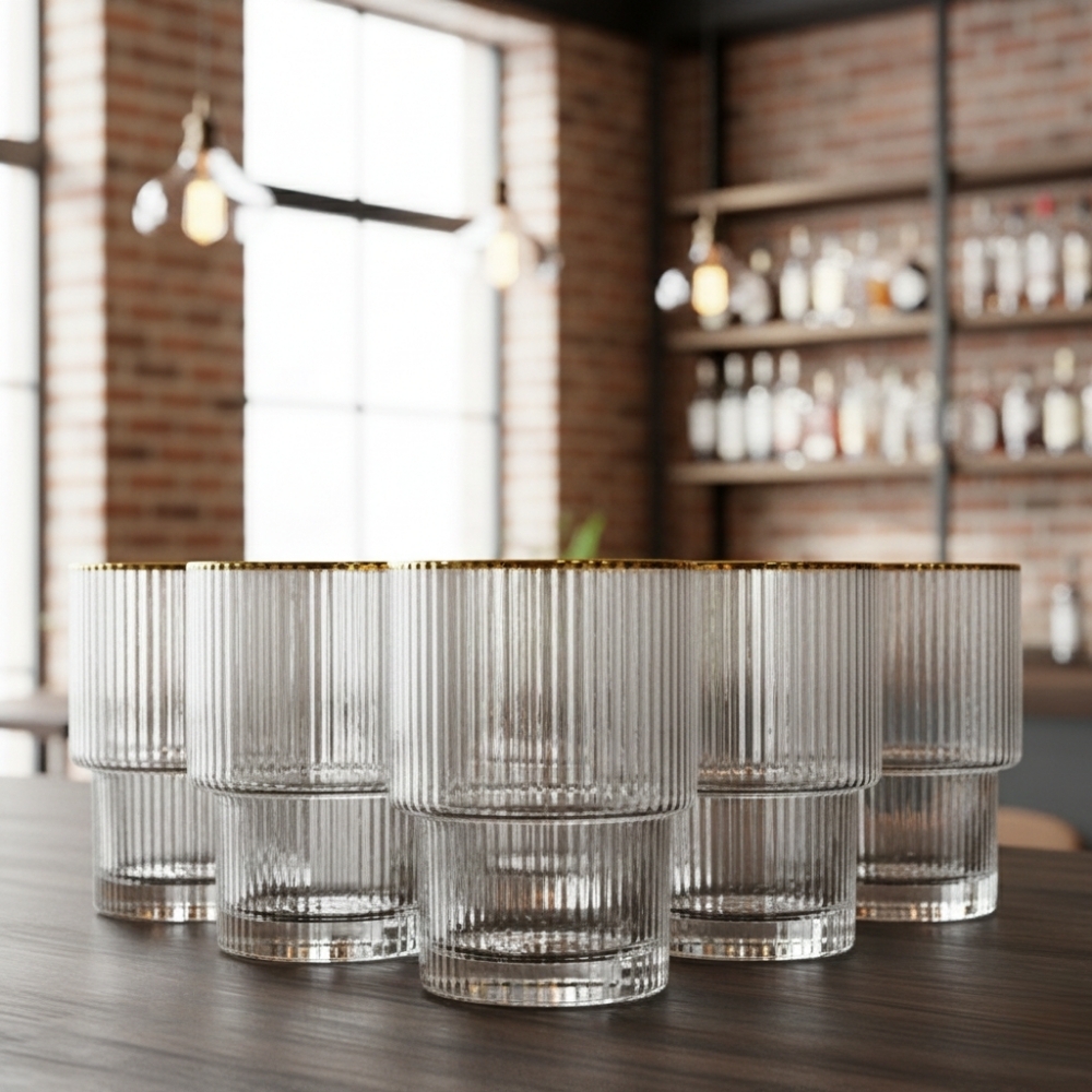 Объем стаканов – 200 мл, высота – 9 см. Стаканы упакованы в крафтовую коробку. В наборе 6 стаканов. Стильные стаканы – это отличный подарок для людей, которые ценят изысканность и элегантность в сервировке. Этот набор стаканов можно подарить как мужчинам, так и женщинам, которые ценят качественные и стильные предметы в интерьере. Стаканы с изысканной золотой обводкой идеально подходят для торжественных моментов и праздничных вечеров. Будучи частью интерьера, эти стаканы добавят шарма и эстетики любому мероприятию. Их можно использовать для подачи и удовольствия любимыми напитками, такими как лимонады, сок, коктейли и т.д.