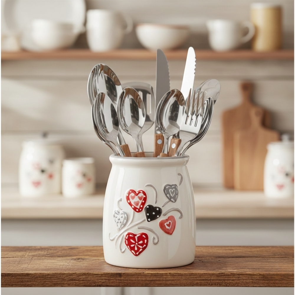 Утримувач призначений для зберігання столових приладів. Виготовлений з якісної кераміки білого кольору з малюнком. Має компактні розміри і займе мінімальну площу на поверхні. У підставці можна розмістити половник, лопатки, вінчики, шумування, силіконові скребки, щипці для спагеті і вони завжди у вас будуть під рукою.