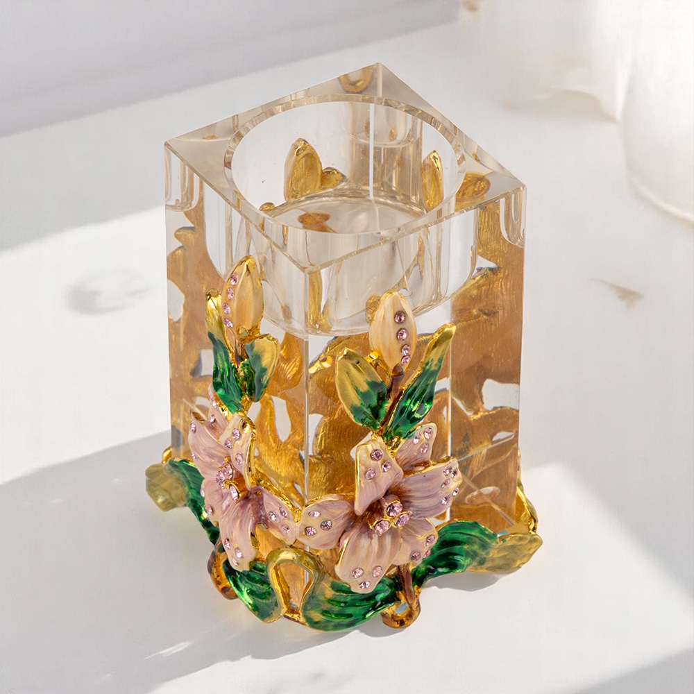 Неймовірно ніжний скляний підсвічник оздоблений витонченими металевими квітами інкрустованими камінчиками підійде на подарунок мамі, сестрі, подрузі.