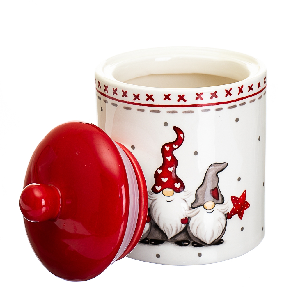 Висота – 15см Діаметр – 10см Об'єм - 500мл Гарно скласти цукерки, горіхи, цукати та інші сипучі продукти вам допоможе новорічна ємність для зберігання. Банка виготовлена з кераміки та прикрашена чудовим принтом із чарівними гномами. Ємність також призначена для оформлення декору в різдвяному стилі, а також її можна подарувати своїм близьким. Святковий декоративний посуд створить затишну атмосферу та прикрасить простір.