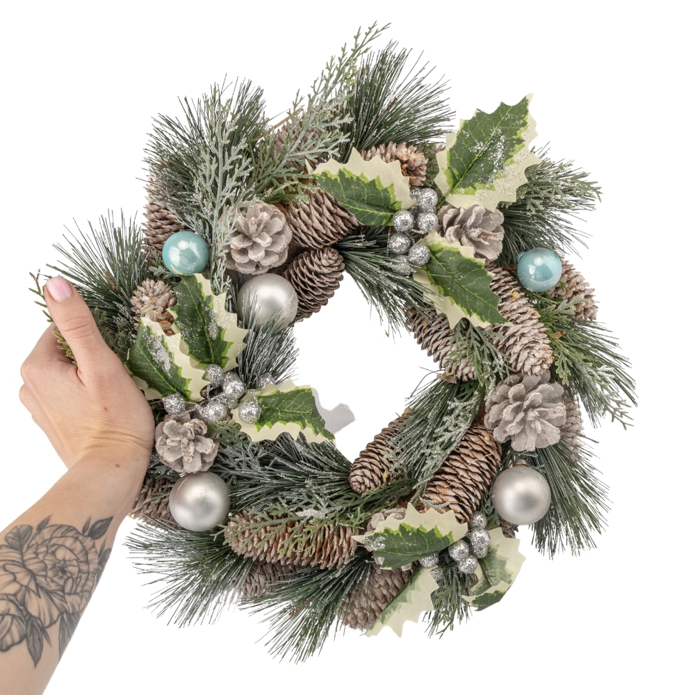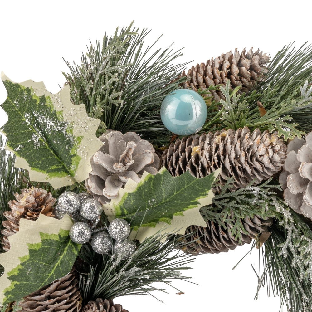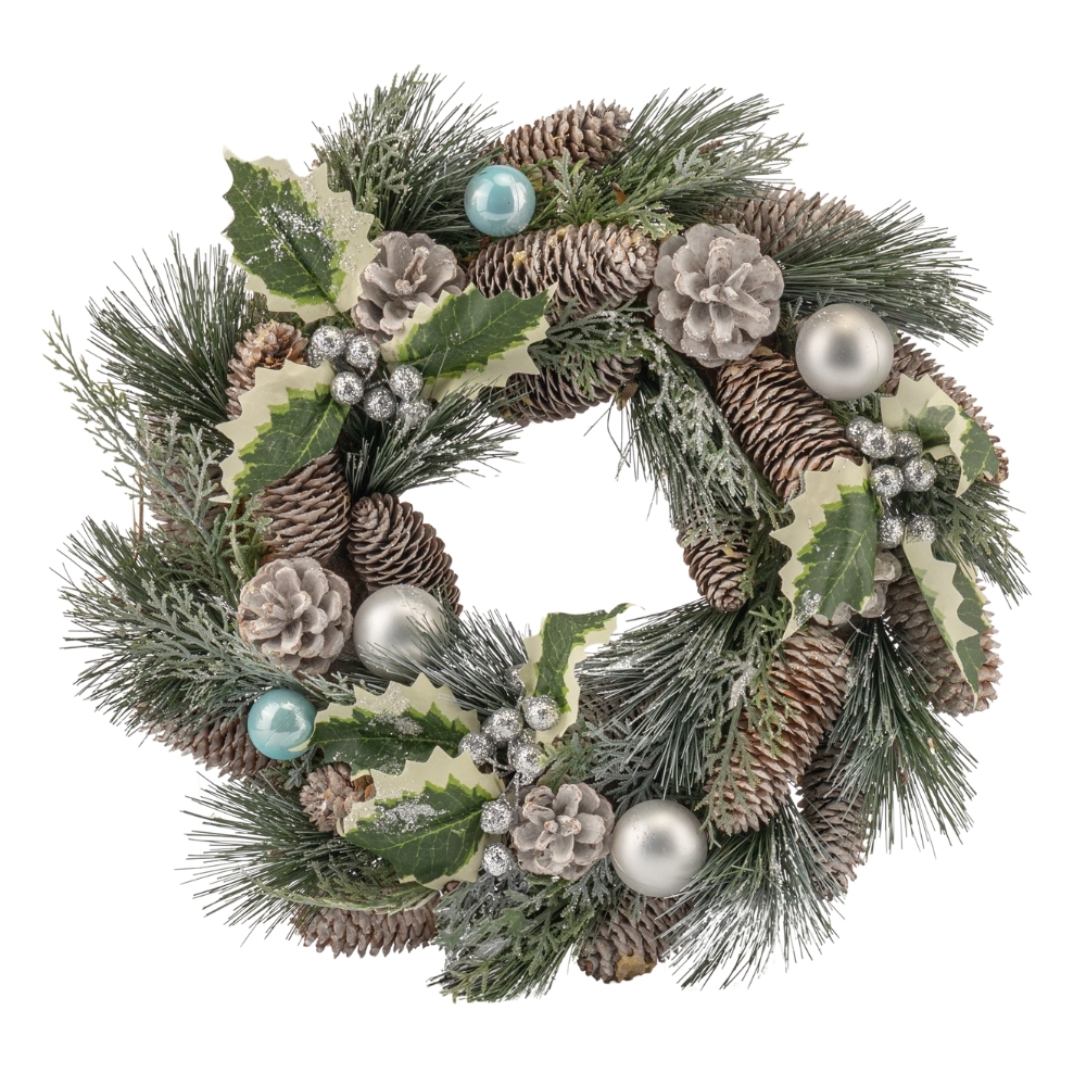 Різдвяний вінок вішають на стіни та вікна, а у вигляді горизонтальної композиції він є окрасою святкового столу. Різдвяний вінок над порогом – це ваш сімейний оберіг, символ надії на щастя, благополуччя та достатку. Це чудовий новорічний аксесуар, який створить святковий настрій у Вашому домі! Він прикрашений ялиновими шишками та кульками. Такий сучасний і досить реалістичний дизайн зможе гармонійно вписатися в будь-який інтер'єр та зробити ваше свято по-справжньому чарівним!