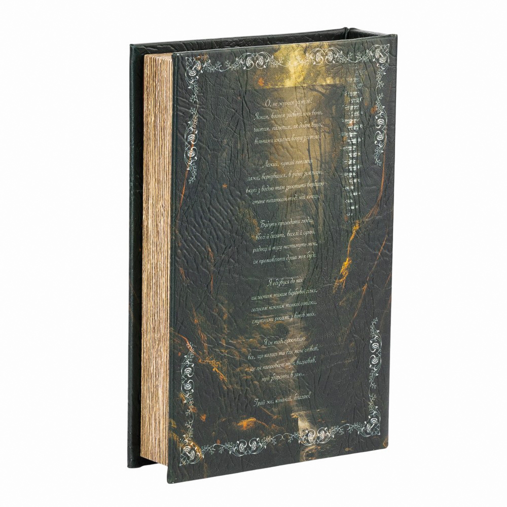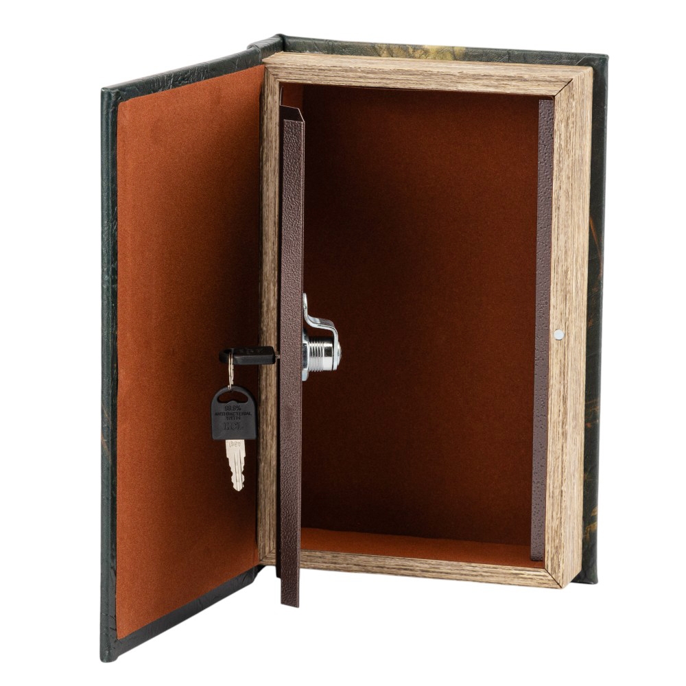 Висота - 26 см, довжина - 17 см, ширина - 5 см. Книга-сейф - це креативний інтер'єрний елемент, який виглядає як звичайна книга, але фактично має внутрішнє сховище. Це прихована система зберігання грошей, документів або інших цінних речей. Всередині сейф закривається на замок компактними ключами, які легко можна заховати в надійне місце. Це не тільки функціональна і корисна в повсякденному житті річ, а й унікально декорована. Завдяки своєму зовнішньому виду книга-сейф легко вписується в книжкову полицю та доповнює будь-який інтер'єр. Чудовий подарунок для друзів та колег.