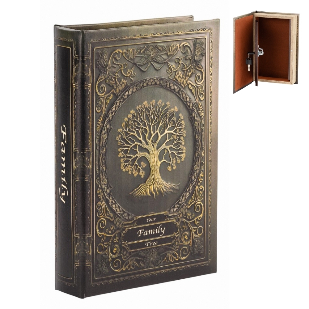 Висота - 26 см, довжина - 17 см, ширина - 5 см. Книга-сейф - це креативний інтер'єрний елемент, який виглядає як звичайна книга, але фактично має внутрішнє сховище. Це прихована система зберігання грошей, документів або інших цінних речей. Всередині сейф закривається на замок компактними ключами, які легко можна заховати в надійне місце. Це не тільки функціональна і корисна в повсякденному житті річ, а й унікально декорована. Завдяки своєму зовнішньому виду книга-сейф легко вписується в книжкову полицю та доповнює будь-який інтер'єр. Чудовий подарунок для друзів та колег.