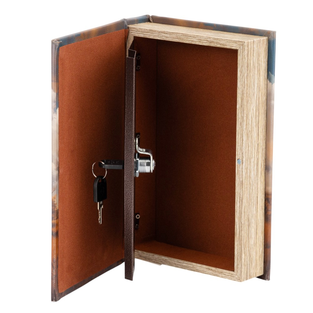 Висота - 26 см, довжина - 17 см, ширина - 5 см. Книга-сейф - це креативний інтер'єрний елемент, який виглядає як звичайна книга, але фактично має внутрішнє сховище. Це прихована система зберігання грошей, документів або інших цінних речей. Всередині сейф закривається на замок компактними ключами, які легко можна заховати в надійне місце. Це не тільки функціональна і корисна в повсякденному житті річ, а й унікально декорована. Завдяки своєму зовнішньому виду книга-сейф легко вписується в книжкову полицю та доповнює будь-який інтер'єр. Чудовий подарунок для друзів та колег.