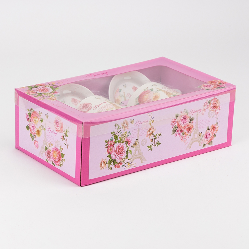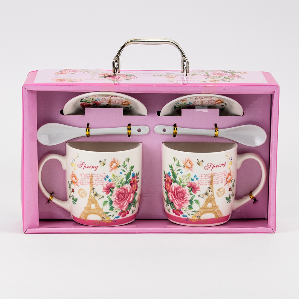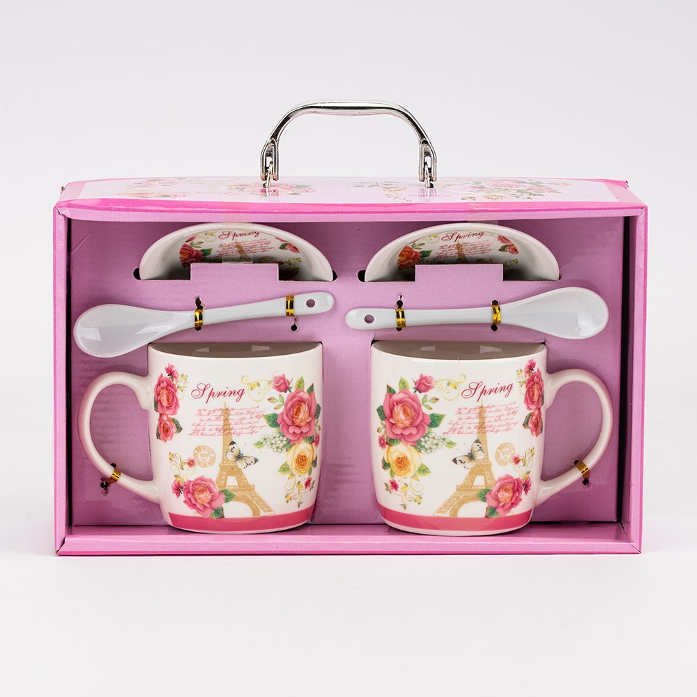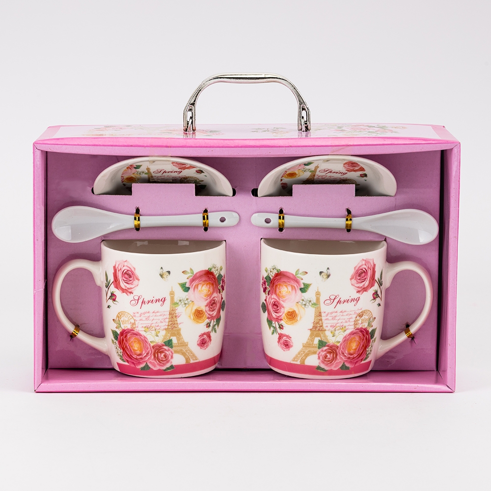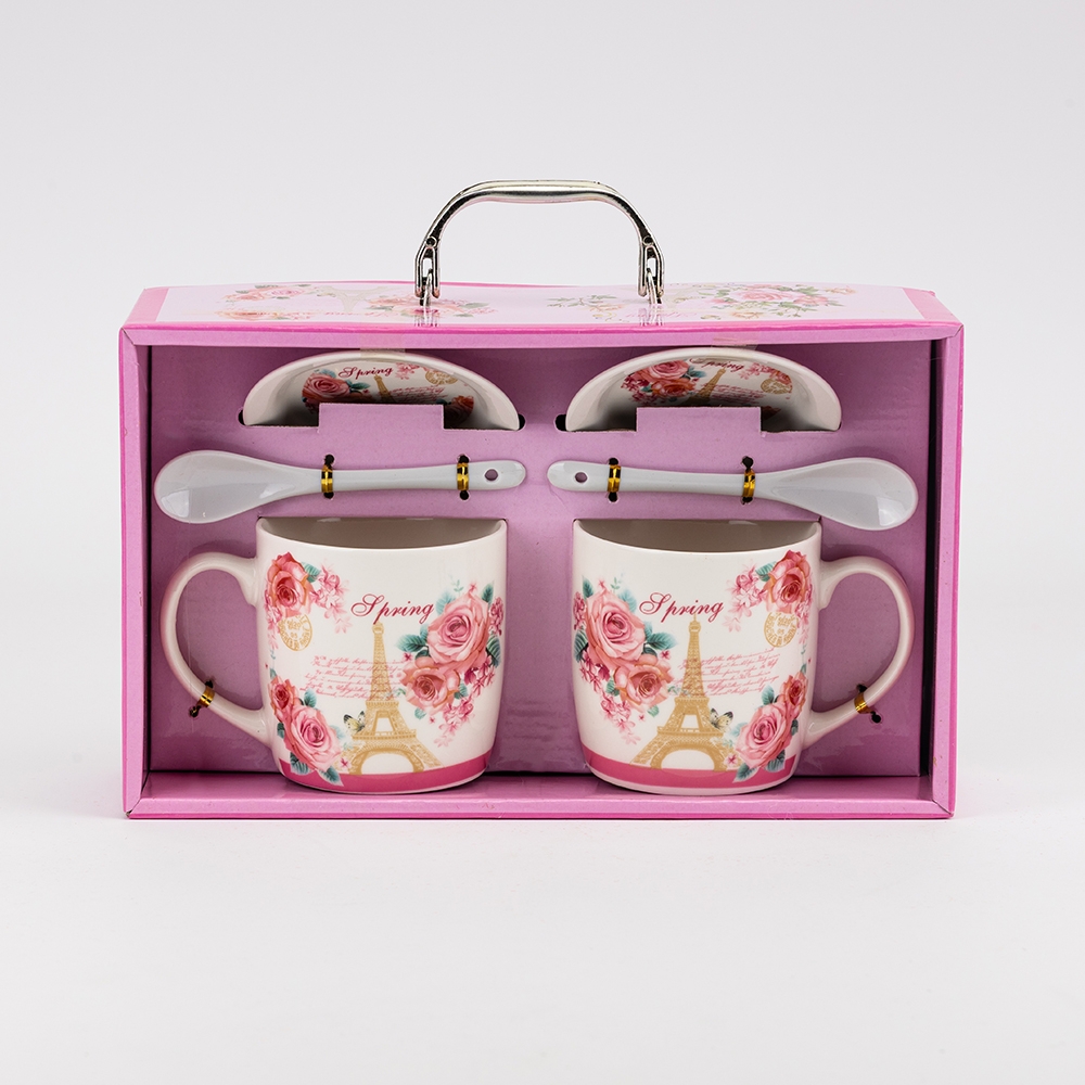 Об'єм — 400 мл. Цей подарунковий набір включає 2 керамічні чашки, блюдця та ложки, оформлені в єдиному стилі. Набір представлений у презентабельній подарунковій упаковці, що робить його готовим рішенням для роздрібної торгівлі та корпоративних привітань. Модель ідеально підходить для оптових замовлень завдяки високій популярності тематичного дизайну, практичності у використанні та привабливому вигляду на вітрині.
