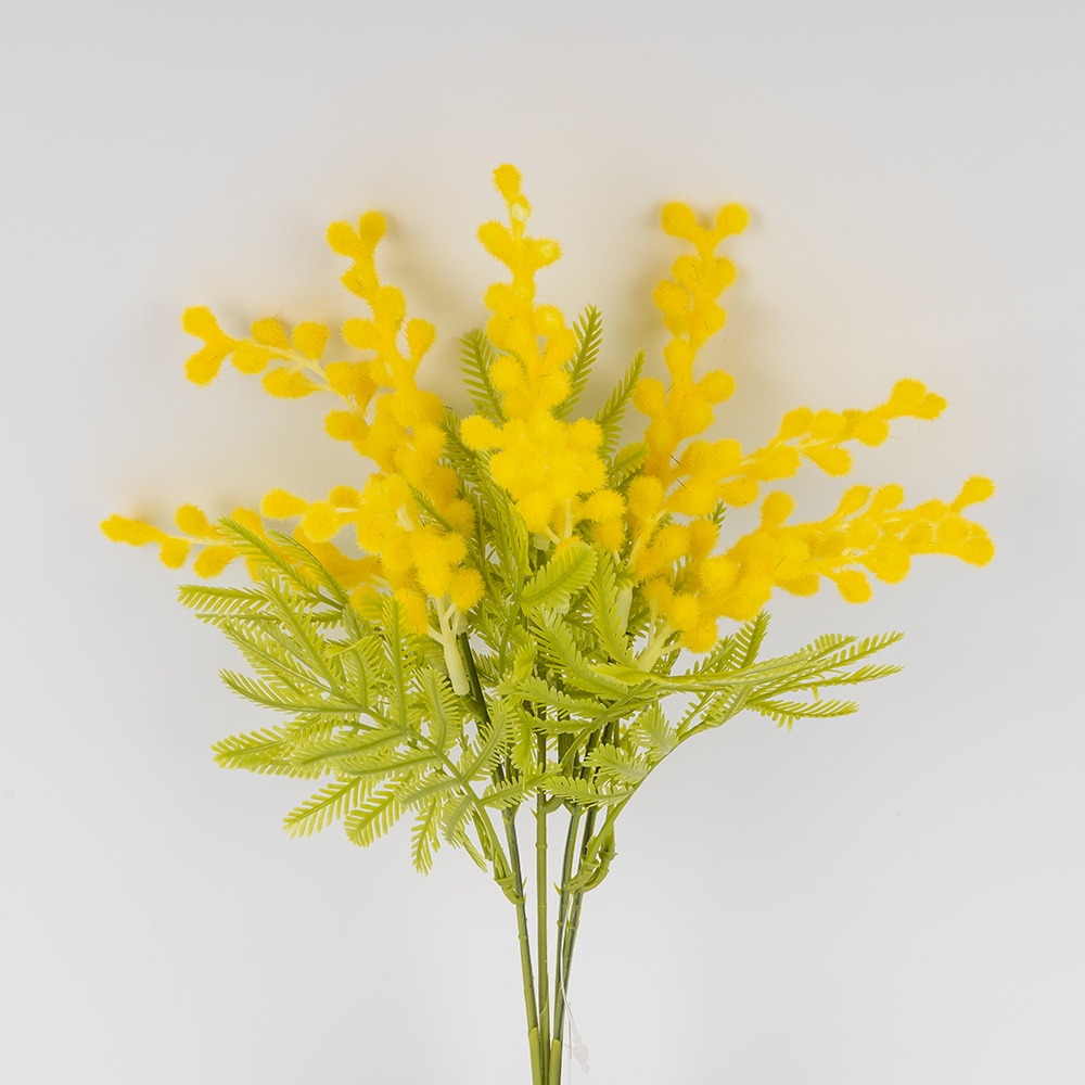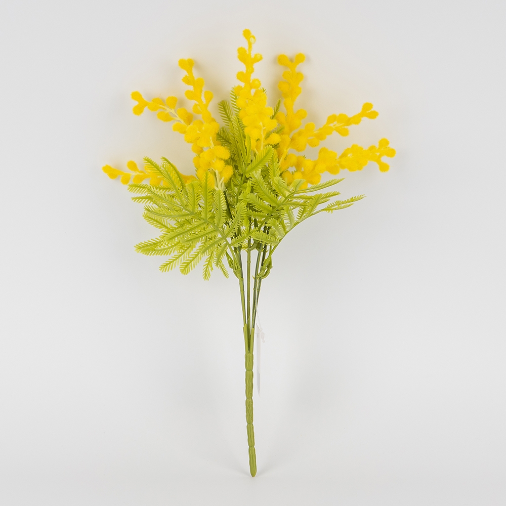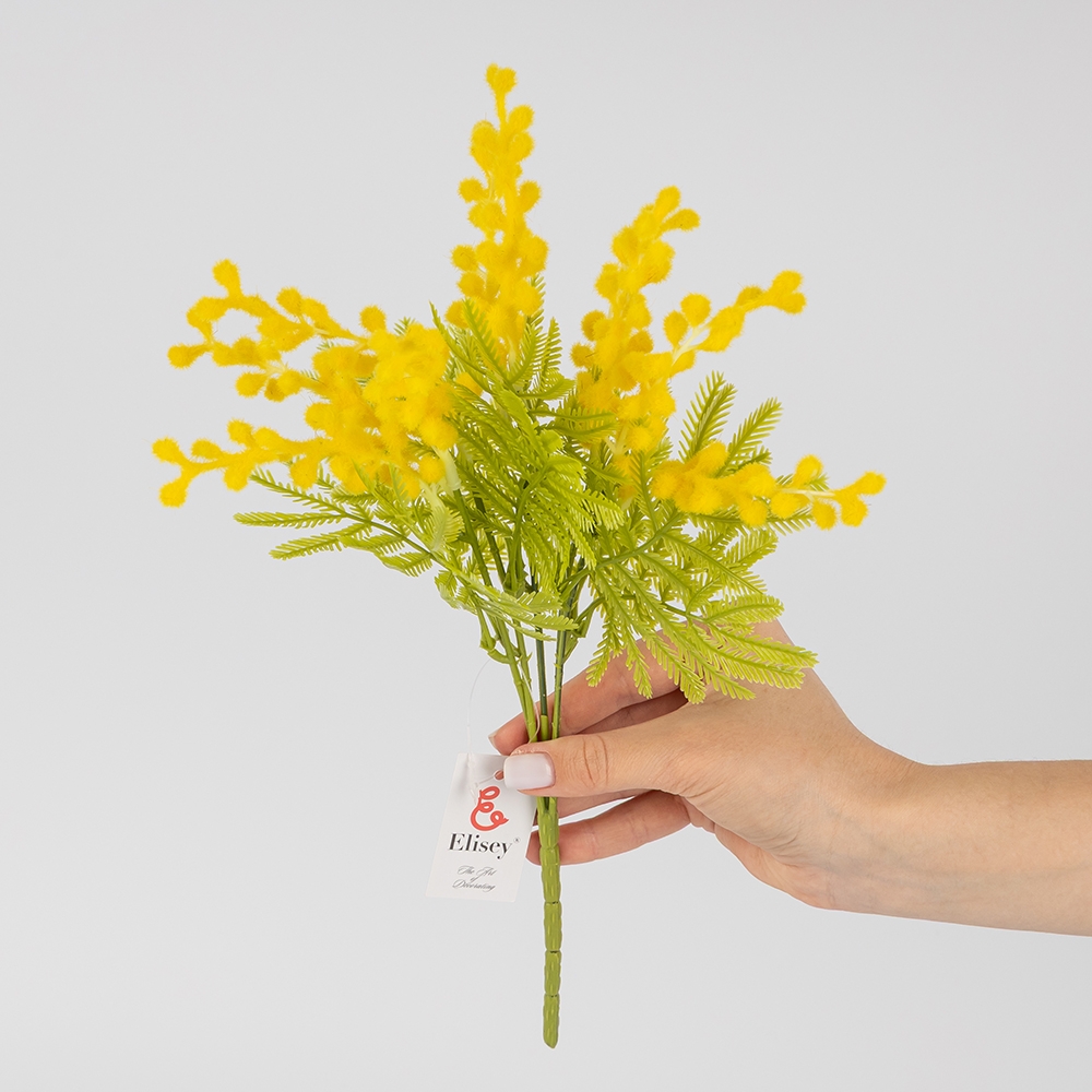 Висота гілки - 33 см, висота квіток мімози - 11 см. Штучна жовта мімоза - це витончено виготовлена репліка природньої мімози з усією її ніжністю та красою. Квіти мають реалістичну форму і текстуру, що нагадують справжню мімозу. Вони дрібні, пухнасті та пушкові, відтворюючи вигляд і дотик справжніх квітів. Стебла тонкі, гнучкі та легко модельовані, імітують структуру та гнучкість природних гілок мімози. Штучна мімоза чудово підходить для декорування інтер'єру, створення букетів або композицій, додає відчуття свіжості та ніжності будь-якому приміщенню та заходу. Матеріал - пластик.