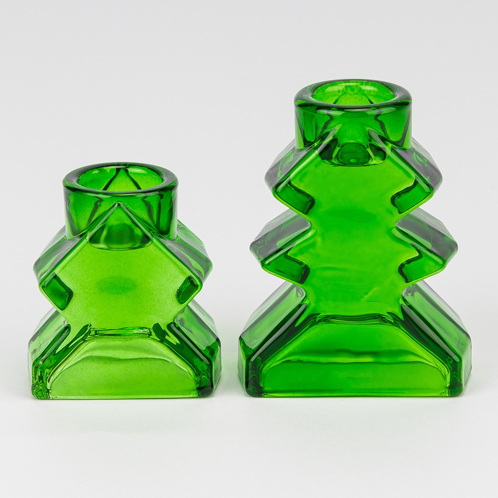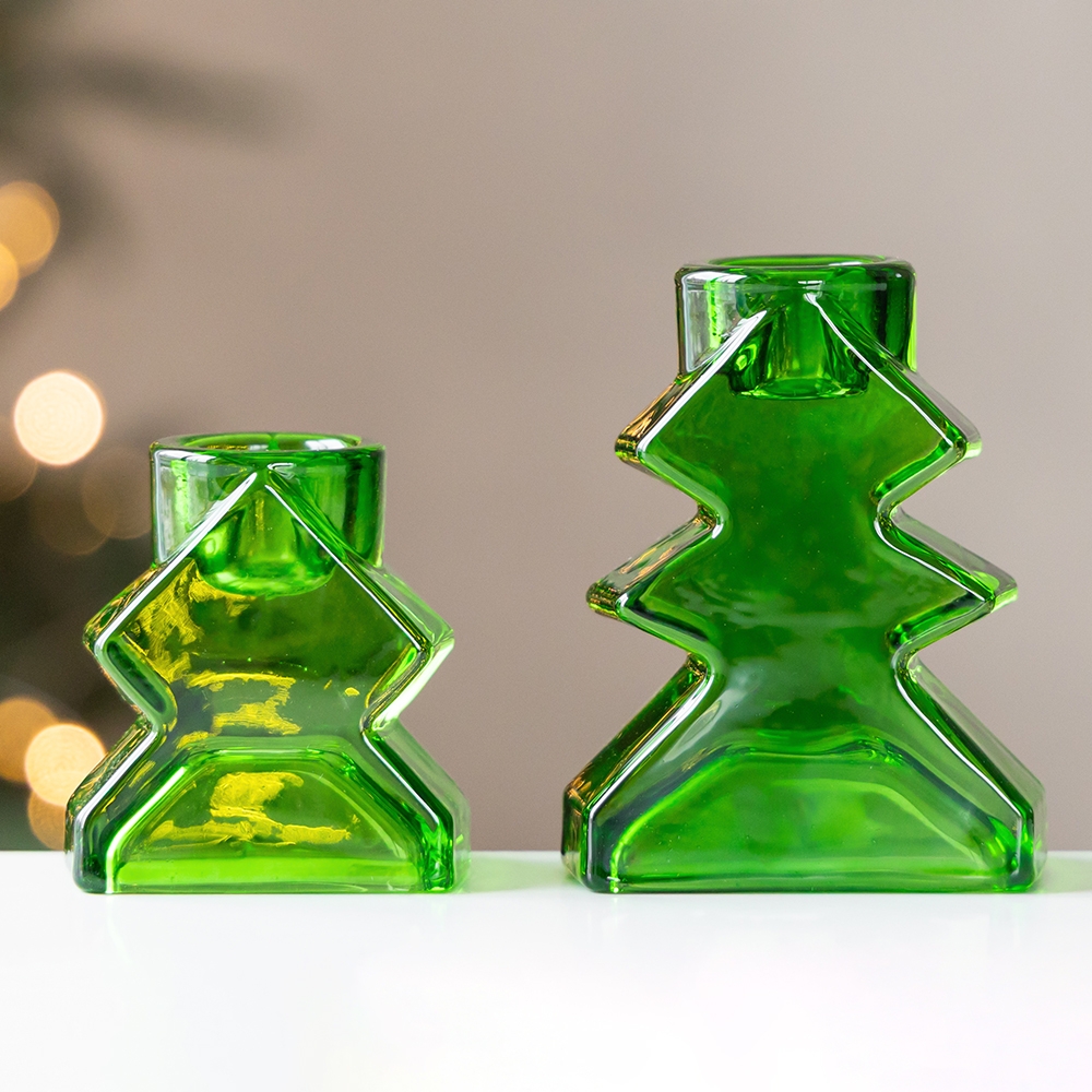 Набір скляних підсвічників для декорування включає 2 ідентичних підсвічника різної висоти: 8,5 см, 6 см. Набір підсвічників у вигляді ялинки — святковий акцент, який додасть затишку вашому дому. Виготовлені з зеленого скла, вони чудово переливаються у світлі вогню та створюють атмосферу тепла й гармонії. Такий декор стане окрасою святкового столу чи полички, доповнить зимовий інтер’єр та підкреслить новорічний настрій. Міцні й якісні, підсвічники можна використовувати багато сезонів поспіль.