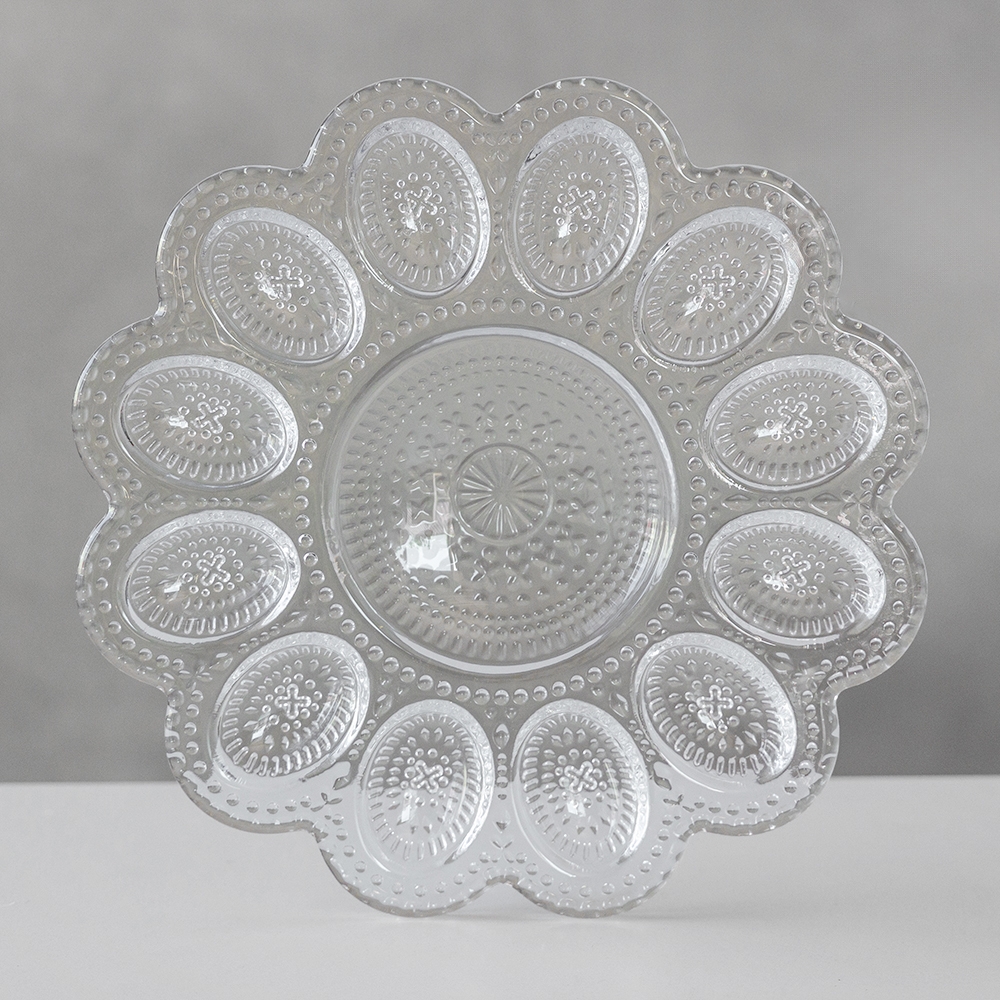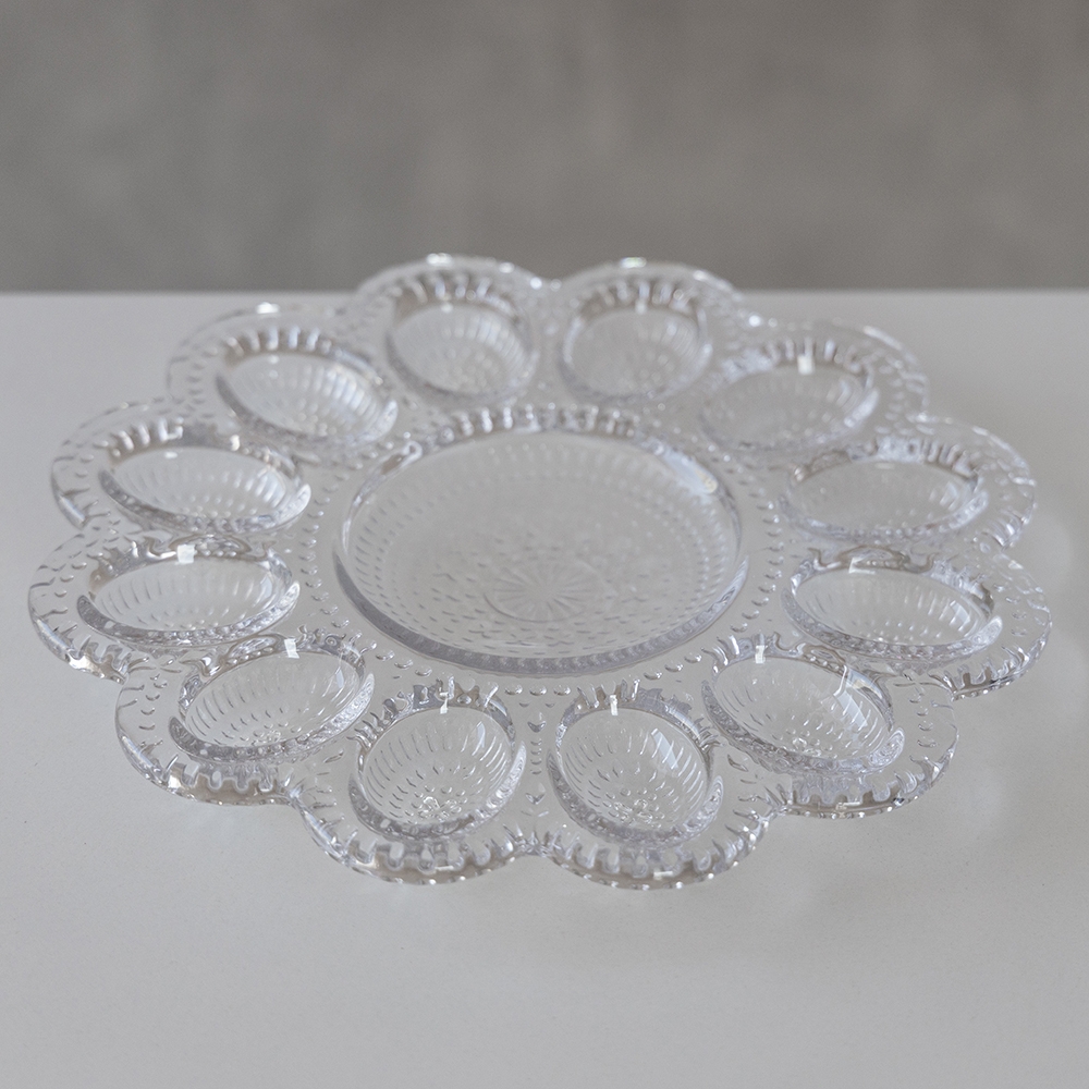Ширина — 26,5 см, висота — 2,5 см. Ця витончена скляна підставка для 12 яєць — ідеальне рішення для великоднього столу та сервірування святкового сніданку. У центрі підставки передбачене місце для паски, що робить композицію ще більш гармонійною та зручною. Виготовлена з прозорого скла. Ергономічна форма з плавними контурами забезпечує зручне розміщення яєць, а стильний дизайн робить її чудовим доповненням весняного декору. Така підставка стане не лише практичним аксесуаром, а й гарним подарунком для поціновувачів естетичних деталей у сервіруванні.