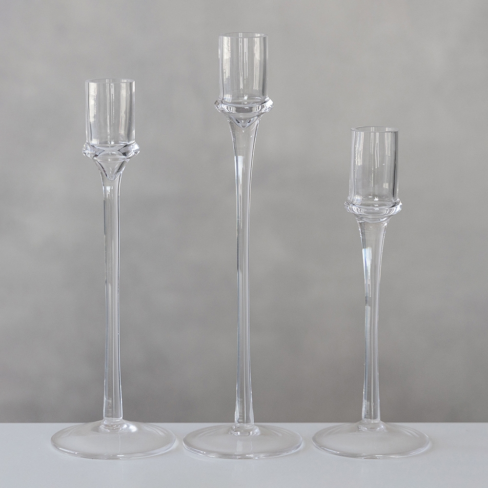 Набір скляних підсвічників для декорування включає 3 підсвічники різної висоти: висота найвищого - 26 см. Ці витончені скляні підсвічники стануть ідеальним акцентом для створення елегантної та святкової атмосфери. Виготовлені з прозорого скла преміум-якості, вони мають мінімалістичний дизайн. Підходять для стандартних тонких свічок, включаючи декоративні закручені моделі. Чудово виглядають у сервуванні святкового столу, як елемент романтичного декору або як частина інтер’єру ресторану чи готелю. Високі, прозорі та легкі, ці підсвічники підкреслюють стиль та витонченість простору, створюючи затишок і шарм у будь-якому інтер’єрі.