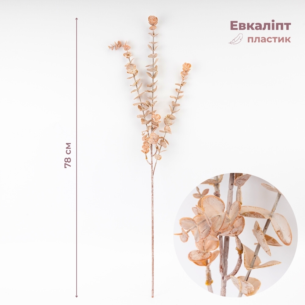 Висота гілки - 78 см. Штучна гілка Евкаліпту - це майстерно виготовлена репліка природної гілки з усією її вродою та зі збереженням бездоганної якості. Листя на гілці має форму та текстуру, подібні до натурального листя. Кожна деталь ретельно пророблена, а стебла надають гнучкості та можливості моделювання гілки в потрібному положенні. Штучна гілка є чудовою альтернативою живим рослинам, оскільки вона зберігає всю привабливість, має більш довговічні властивості та можливість використання у різних декоративних цілях. Чудово впишеться у декор будь-якого приміщення, букетів, композицій чи аранжування інтер'єру, додаючи природної свіжості та елегантності.