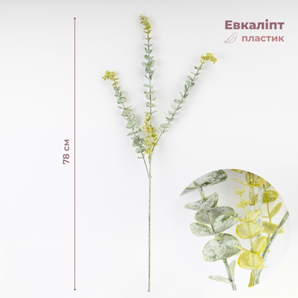 Висота гілки - 78 см. Штучна гілка Евкаліпту - це майстерно виготовлена репліка природної гілки з усією її вродою та зі збереженням бездоганної якості. Листя на гілці має форму та текстуру, подібні до натурального листя. Кожна деталь ретельно пророблена, а стебла надають гнучкості та можливості моделювання гілки в потрібному положенні. Штучна гілка є чудовою альтернативою живим рослинам, оскільки вона зберігає всю привабливість, має більш довговічні властивості та можливість використання у різних декоративних цілях. Чудово впишеться у декор будь-якого приміщення, букетів, композицій чи аранжування інтер'єру, додаючи природної свіжості та елегантності.