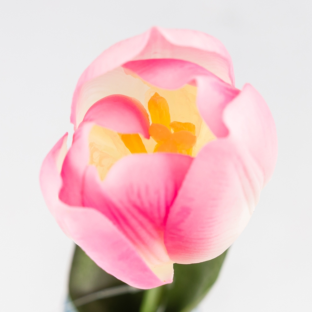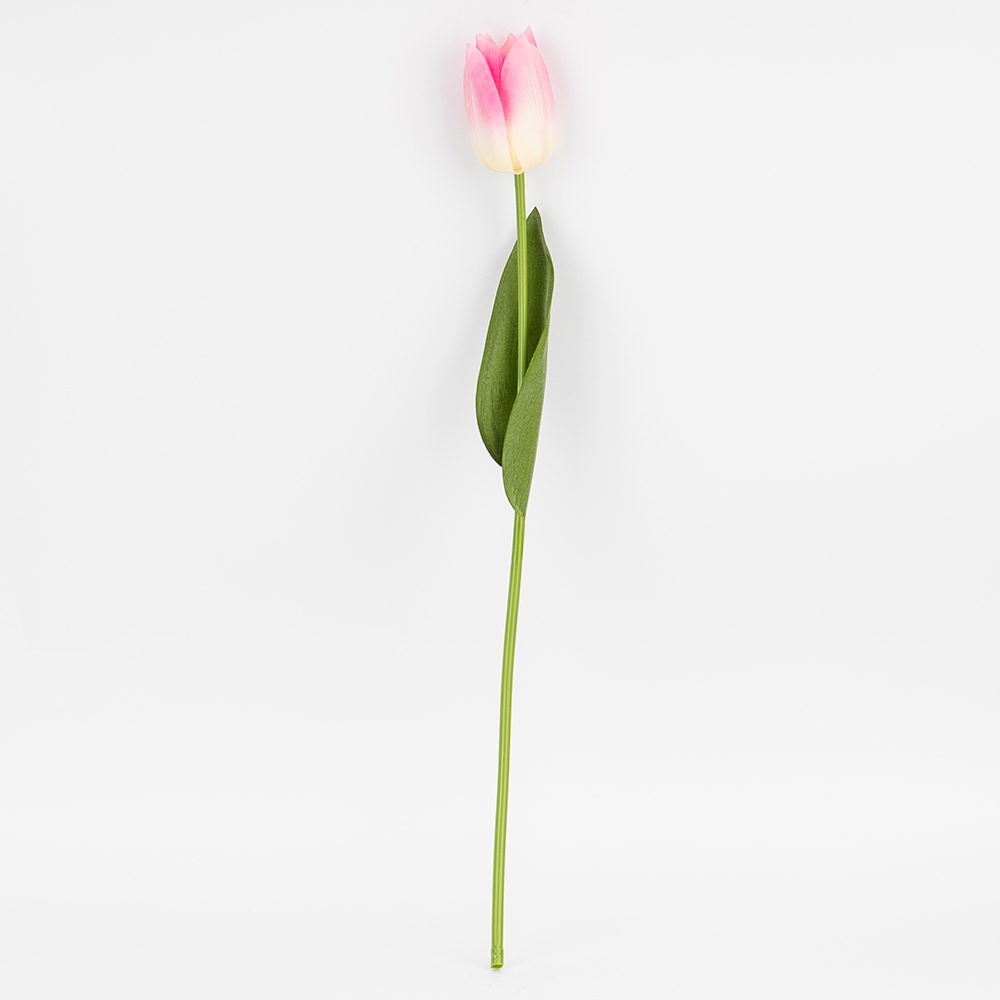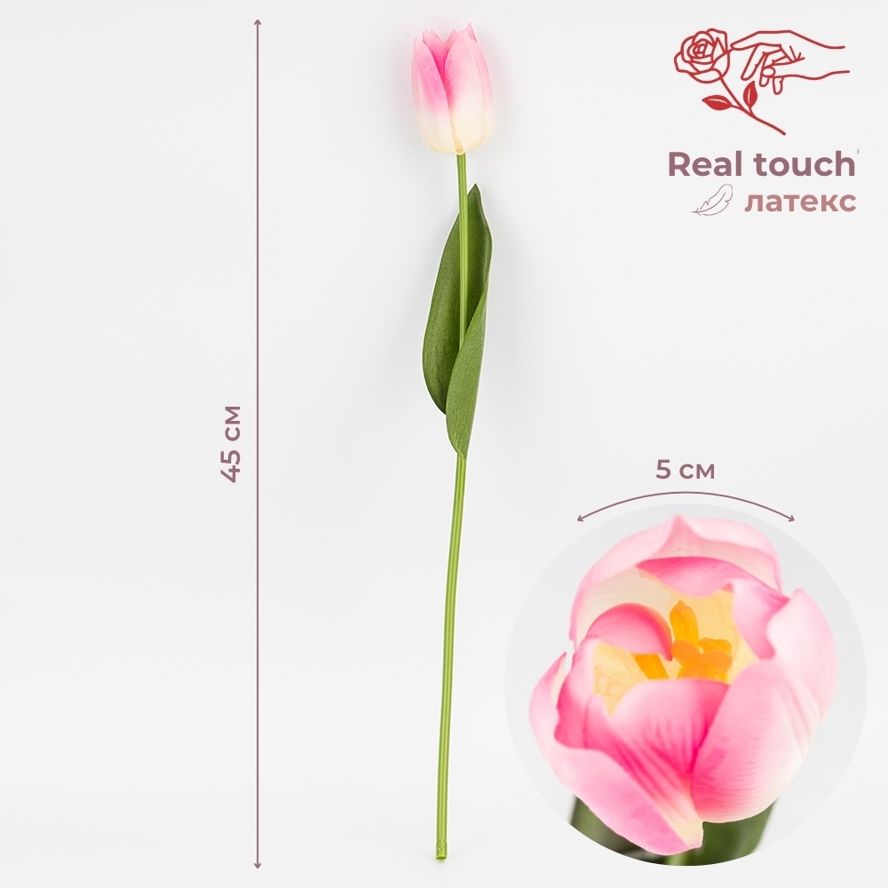 Висота — 45 см. Діаметр бутона — 5 см. Штучний тюльпан з колекції «Ніжний дотик» вражає своєю реалістичністю — пелюстки мають м’яку натуральну текстуру, яку практично неможливо відрізнити від живої квітки. Міцне та водночас гнучке стебло дозволяє легко надавати тюльпану потрібну форму, що робить його ідеальним для флористичних композицій, оформлення фотозон, залів, святкових декорацій чи інтер’єрного декору. Листя з латексу додає ще більше природності та глибини образу. Професійний вибір для ресторанів, готелів, фотостудій та флористів, яким потрібна квітка, що не відрізняється від живої та зберігає бездоганний вигляд у будь-яких умовах.