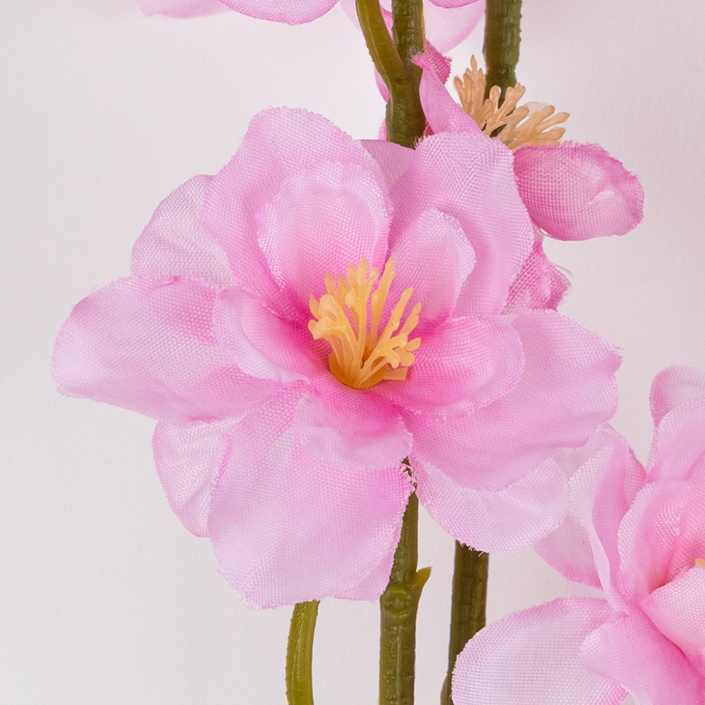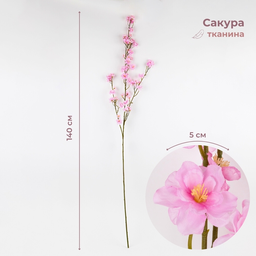 Висота – 140 см. Діаметр квітів від 3 см до 5 см. Виконана з тканини. Штучна гілка сакури з ніжними квітами виглядає елегантно та максимально реалістично, наповнюючи простір атмосферою весни та легкості. Акуратні пелюстки й природне розташування квітів створюють ефект живої гілки у період цвітіння. Висота робить її ідеальним вибором для декоративних арок, фотозон, вітрин та святкових інтер’єрних композицій. Така гілка стане стильним акцентом у декорі й зберігатиме привабливий вигляд упродовж тривалого часу.