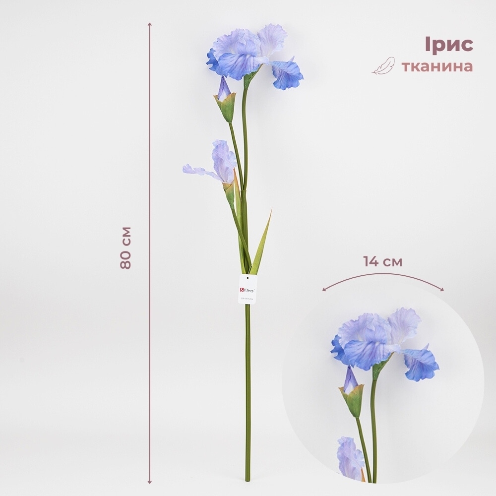 Висота - 80 см. Діаметр найбільшої квіти - 14 см. Штучний ірис виглядає надзвичайно елегантно і реалістично. Його пелюстки мають насичений колір, відтінок з тонкими градієнтами, що переходять у світліші або темніші тони по краям, надаючи квітці природної глибини. Пелюстки м'які на дотик, злегка хвилясті та мають характерний для ірисів витончений вигин, створюючи ілюзію свіжості та легкості. Стебло квітки — міцне, покрите тонким зеленим шаром, що імітує текстуру справжнього стебла. Листя витягнуте, довге і стріловидної форми, також виконане з реалістичних матеріалів з приємною на дотик текстурою. Висота 80 см робить цей ірис ідеальним для використання у високих вазах, декорування інтер'єру чи створення флористичних композицій. Завдяки довговічності матеріалів, ірис зберігає свою форму і яскравість кольорів на довгий час, не потребуючи догляду.