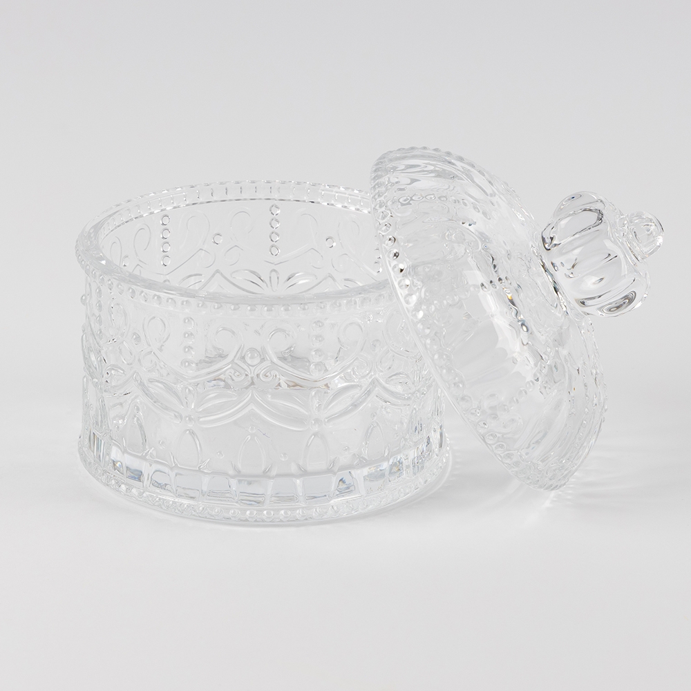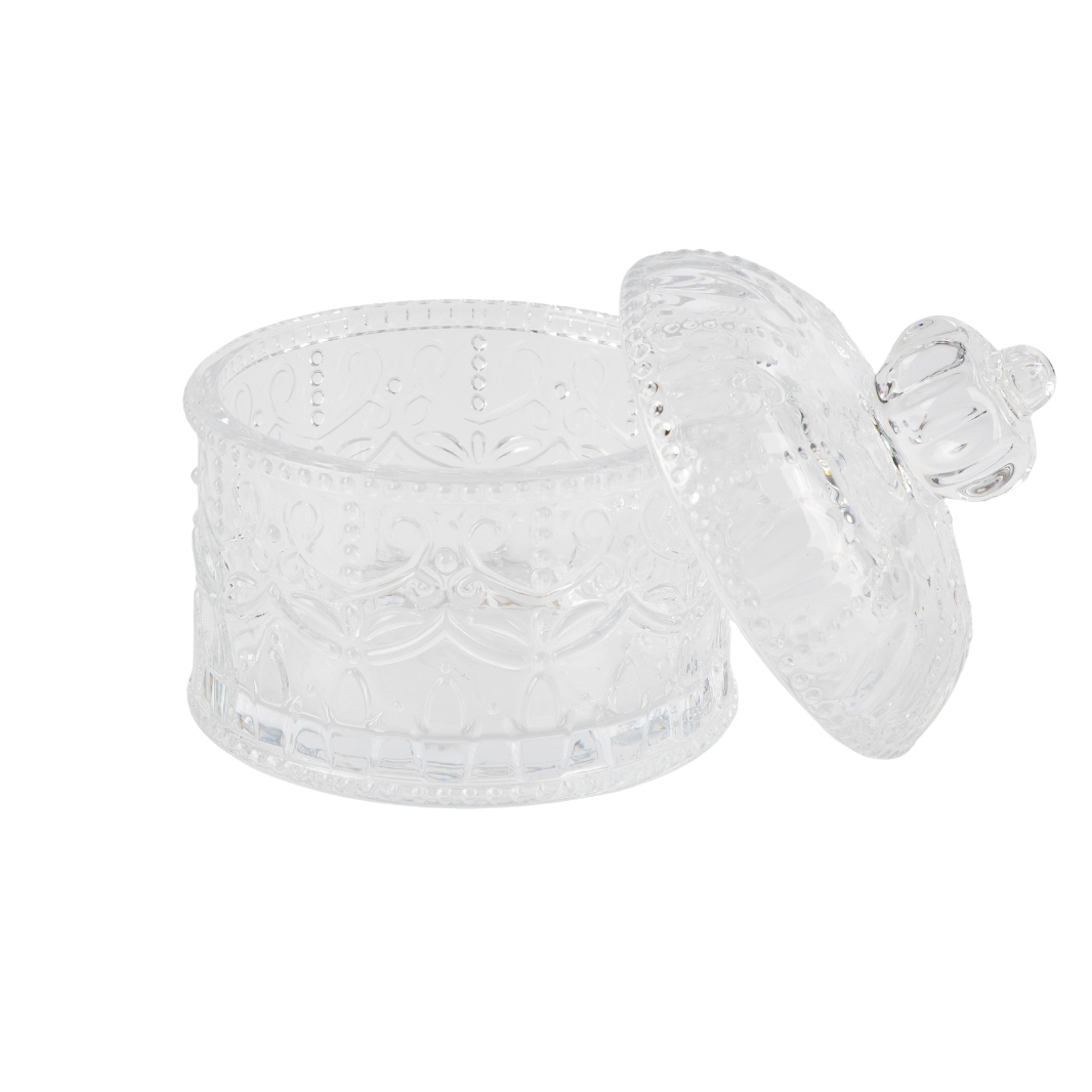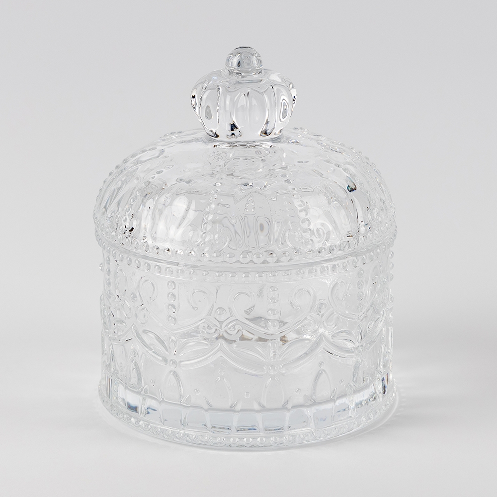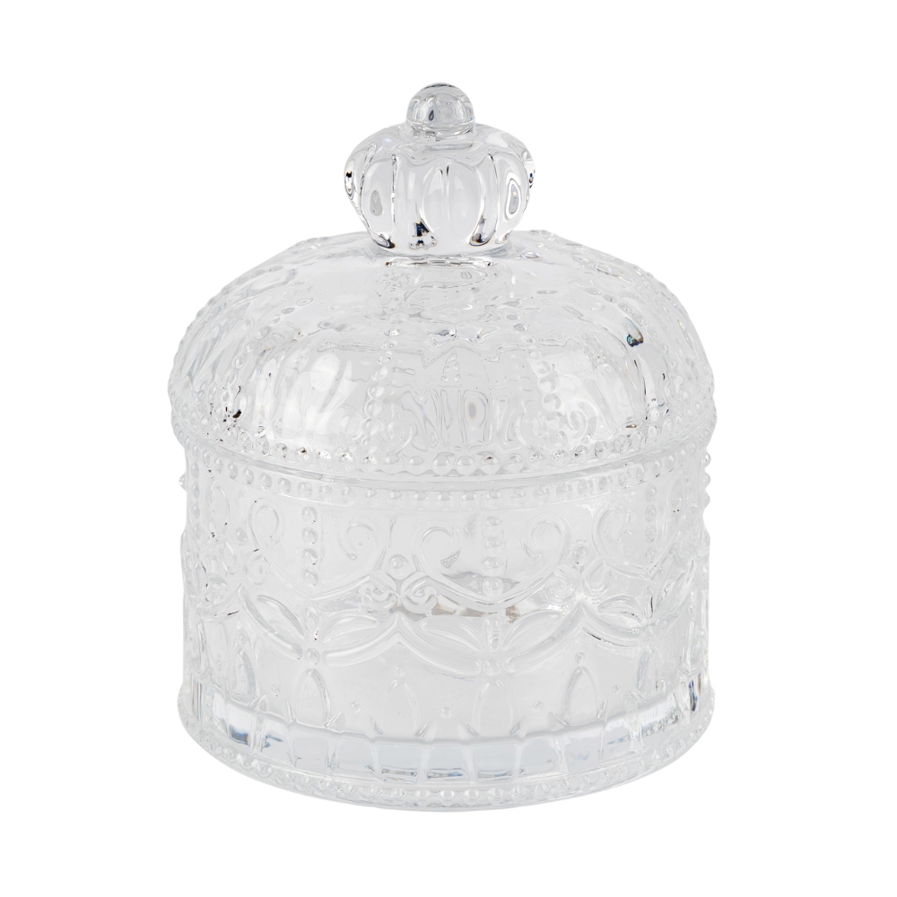 Висота з кришкою - 11 см, висота без кришки - 5,5 см, діаметр - 7,5 см. Вишукана скляна ємність для зберігання з кришкою у формі корони, оздоблена витонченим рельєфним візерунком. Її поверхня грайливо відбиває світло, створюючи ефект кришталевого блиску. Округла форма додає елегантності, а фігурна ручка забезпечує зручність у користуванні. Ідеально підходить для зберігання солодощів, цукру або декоративних дрібничок, гармонійно доповнюючи інтер’єр у класичному чи романтичному стилі.