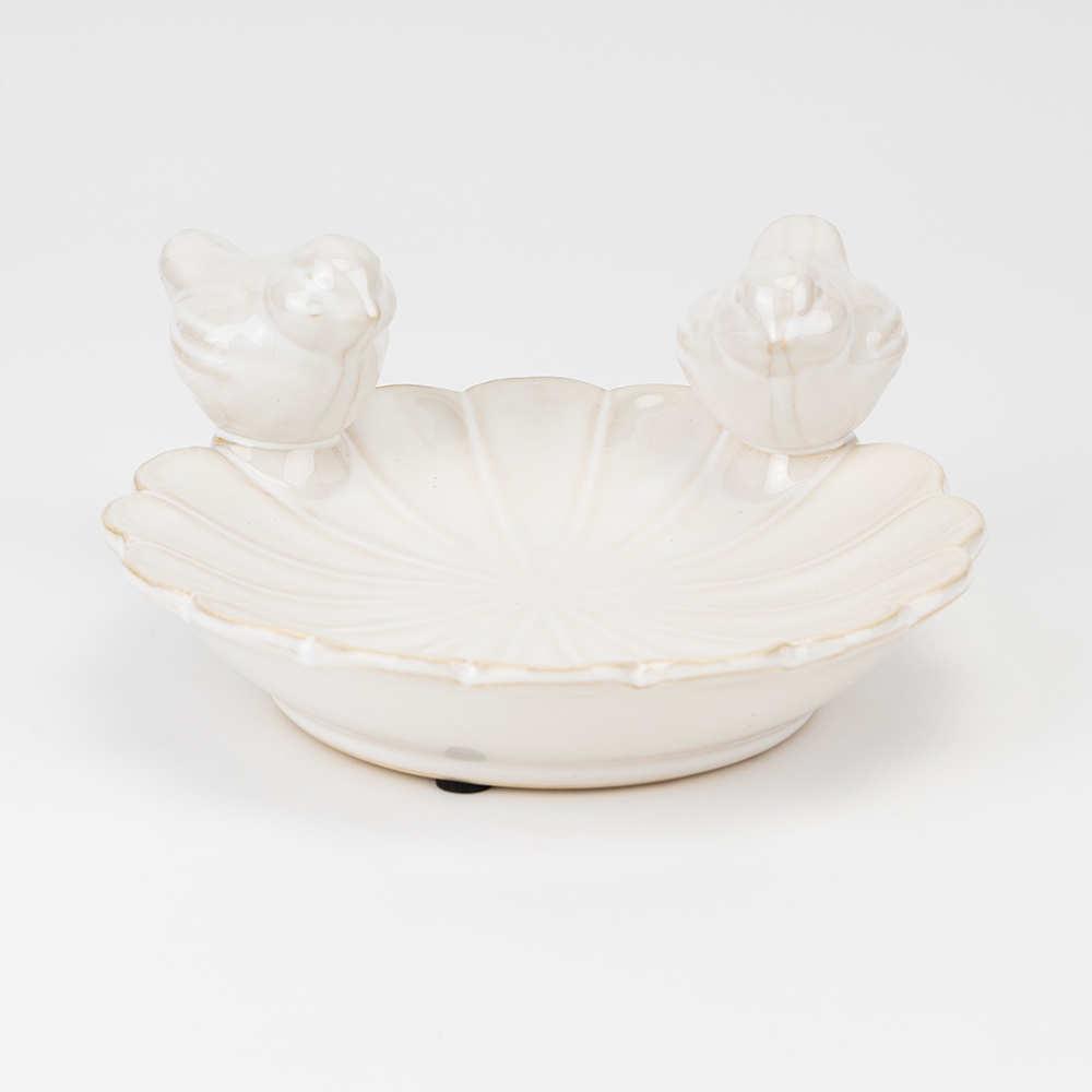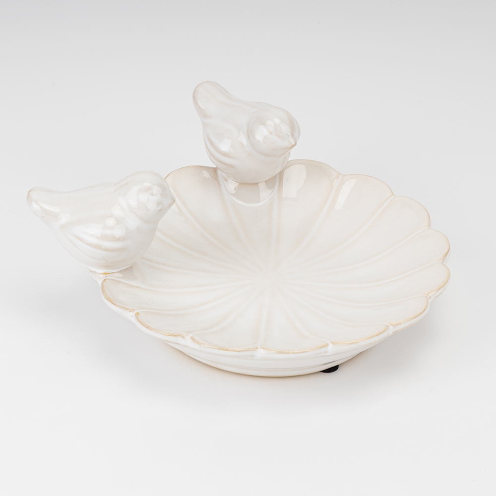 Діаметр — 20 см. Керамічне блюдо поєднує в собі витончену форму та декоративні деталі, що роблять його справжнім акцентом сервірування. М’які лінії створюють відчуття руху й легкості, а керамічна поверхня з делікатним покриттям додає виробу глибини та благородного вигляду. Особливої чарівності дизайну надають декоративні пташки, які додають виробу природної, майже казкової атмосфери. Таке блюдо стане стильним елементом подачі страв і водночас може використовуватись як декоративний предмет для сервірування чи оформлення інтер’єру.